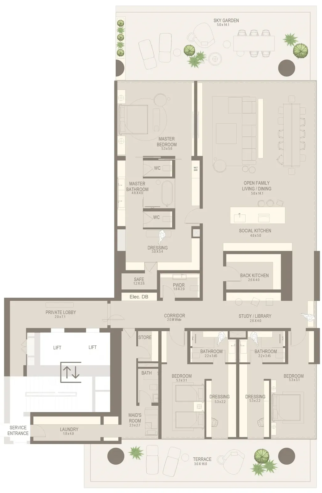 Every residence is crafted to the highest standards of design and functionality, offering open-plan living spaces framed by expansive 3.2-meter floor-to-ceiling windows and breathtaking sky gardens extending five meters toward the horizon. Paired with The Chedi Navigator and Concierge Desk, providing bespoke services around the clock, The Chedi Private Residences Dubai delivers an unrivaled lifestyle of comfort, privacy, and prestige.