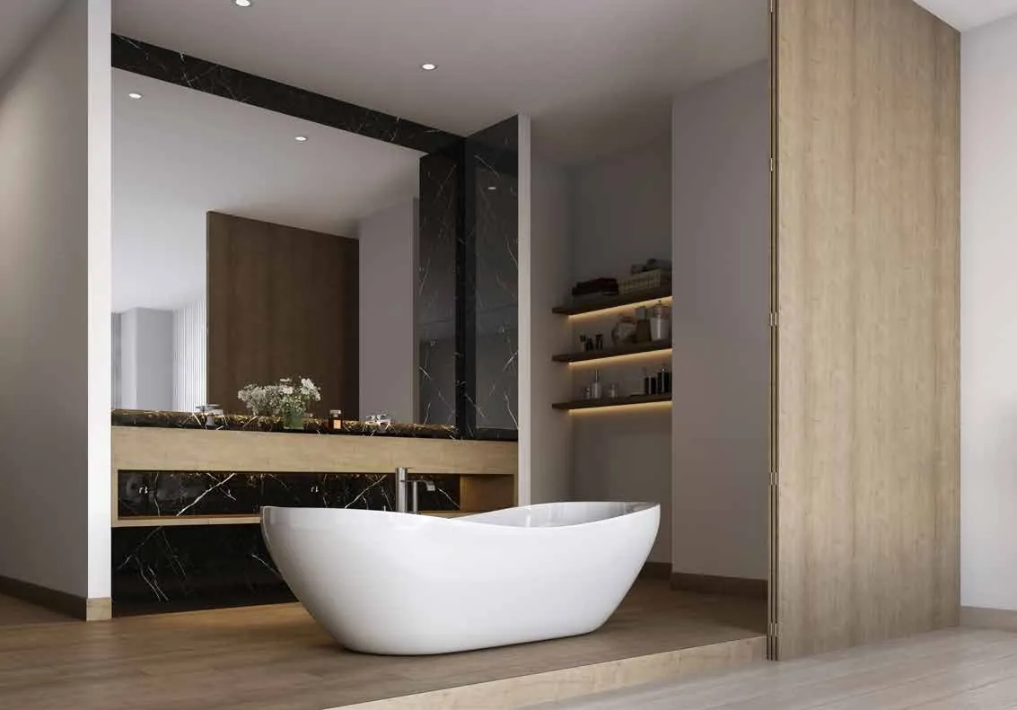 The living room is crafted by the natural light, the promised grandeur is higher than the high-ceiling, ever-dancing dunes. The living room features elegant aesthetics, inspiring lived-in design, and generosity of space in precise dimensions. The bedroom experience design is as real to the mind, as it feels surreal to the eye. It’s like cosiness acquired design. The space is crafted with no expense spared, and the beauty puts up with all your lifestyle choices. Created a space that goes beyond the concept of bathroom. A space designed to be your most intimate, the technology, and every unit of light passing through, is carefully placed and curated. For your eyes only.