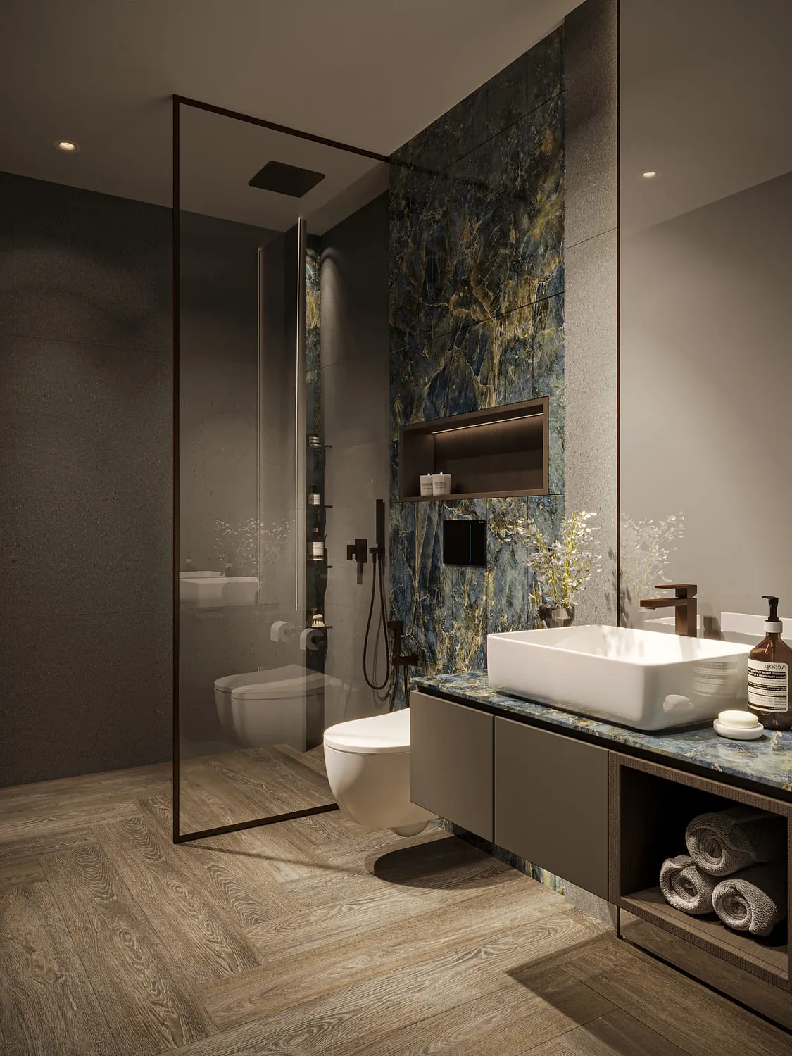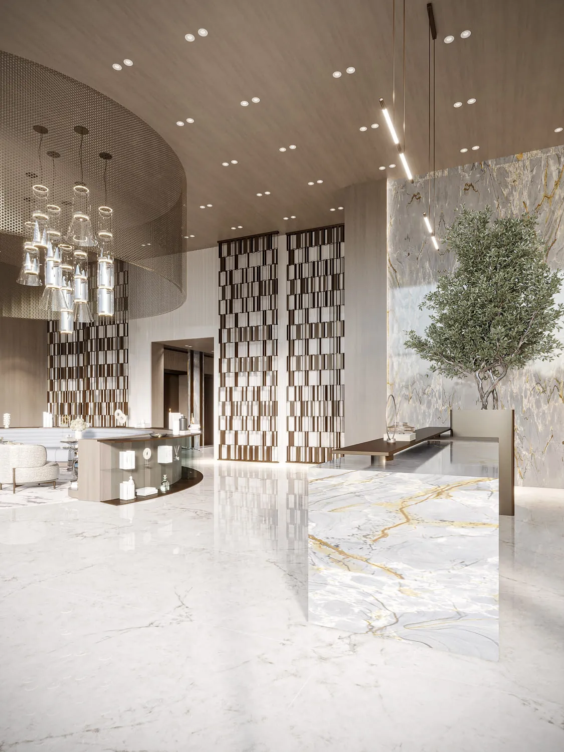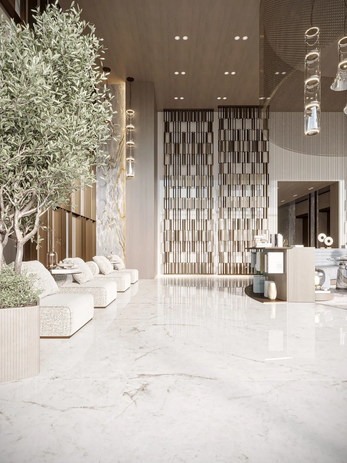 Its meticulously curated space embodies timeless elegance. The interiors of this development evoke new heights of sophistication with a colour palette dominated by sleek shades of grey and calming earthy cool tones, crafting an opulent atmosphere. It features exquisite marbles and stones that elevate each space to an art form, creating an aesthetically contemporary charm.