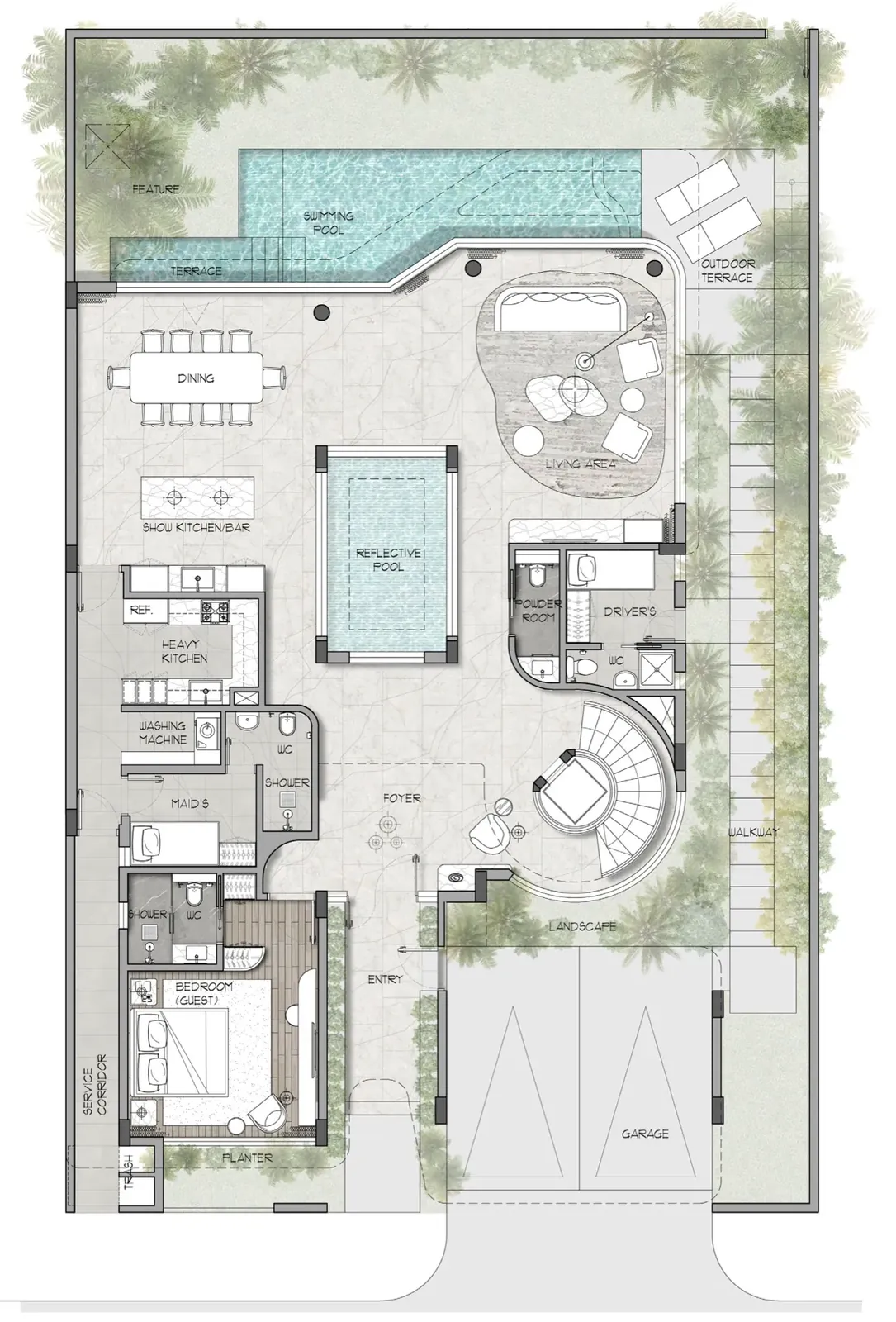 With its sleek, modern architecture that seamlessly blends with the tranquil oasis setting, villas are an intimate living experience for those who desire modernity and liveability. Elegant curves are subtly integrated into a contemporary design adding an element of softness and fluidity to create a modern, welcoming appearance. These villas will indulge your senses every day.