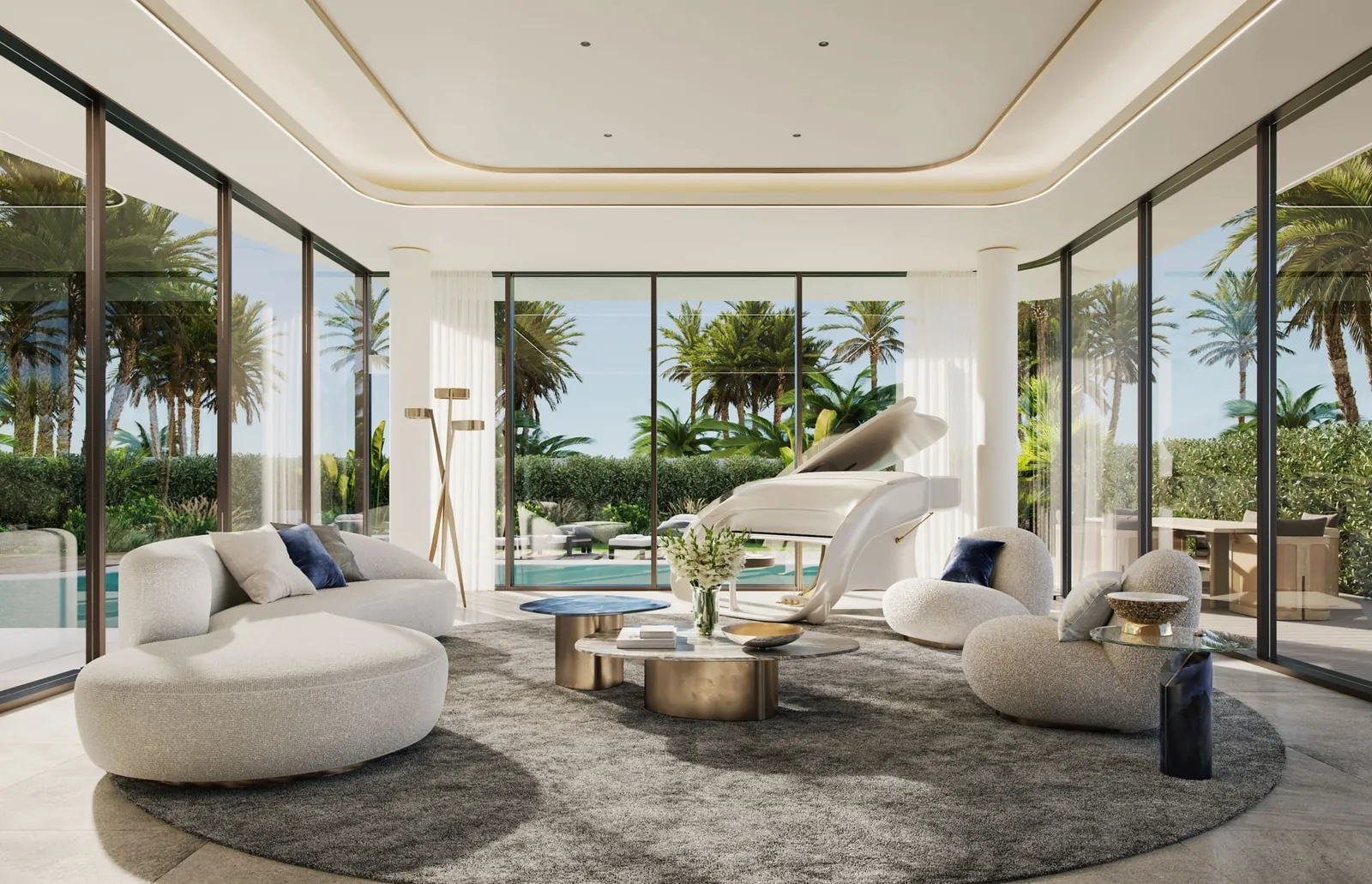 Interior finishings are characterised by a blend of natural stones and sophisticated design elements, an understated elegance that merges the interior spaces with the open greens.