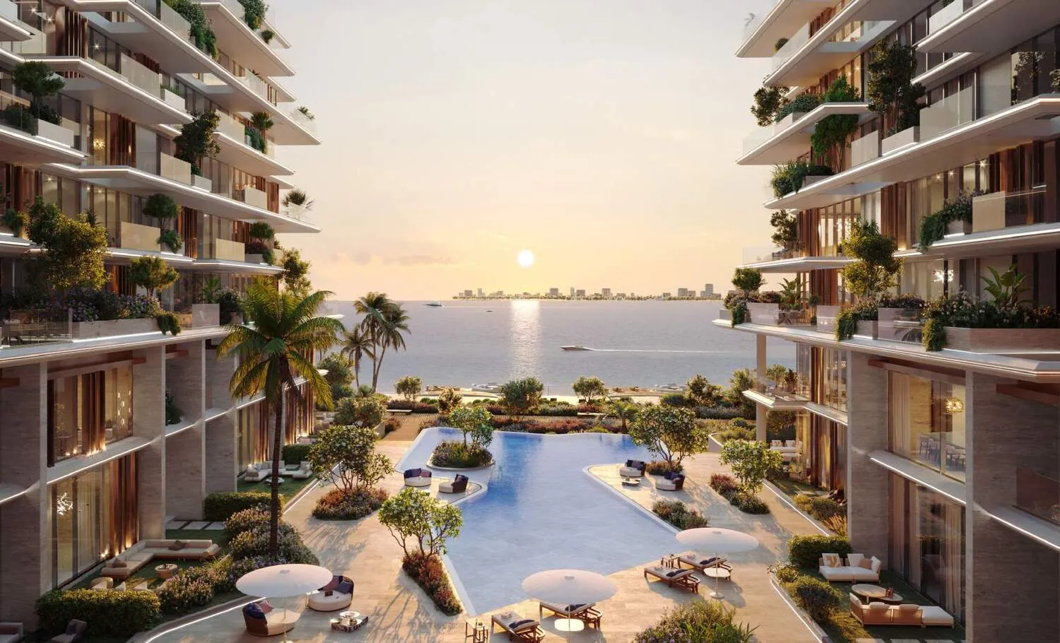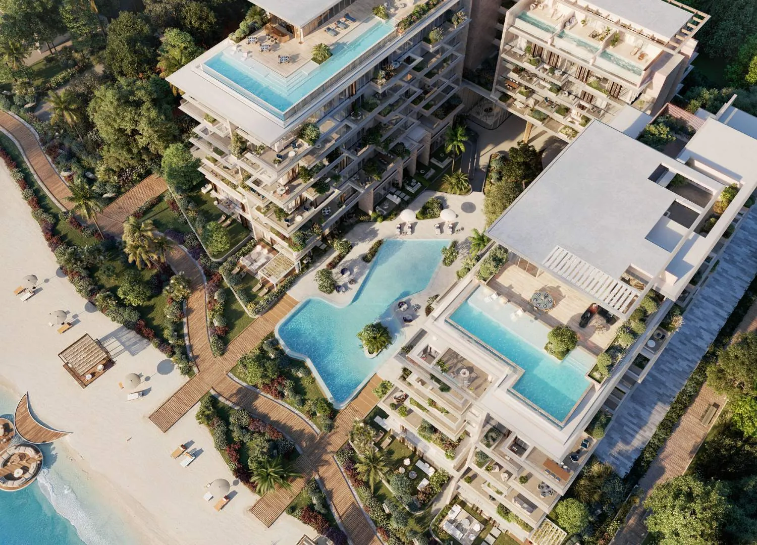 The development features a harmonious selection of residences, including one-, two-, and three-bedroom apartments, as well as townhouses and a signature penthouse. Each unit has been designed to blur the boundary between indoor and outdoor spaces, with expansive terraces, panoramic openings, and double-height volumes. Interiors are sculpted with natural tones and textures that echo sand, water, and moonlight, evoking calm sophistication while providing both privacy and openness.
