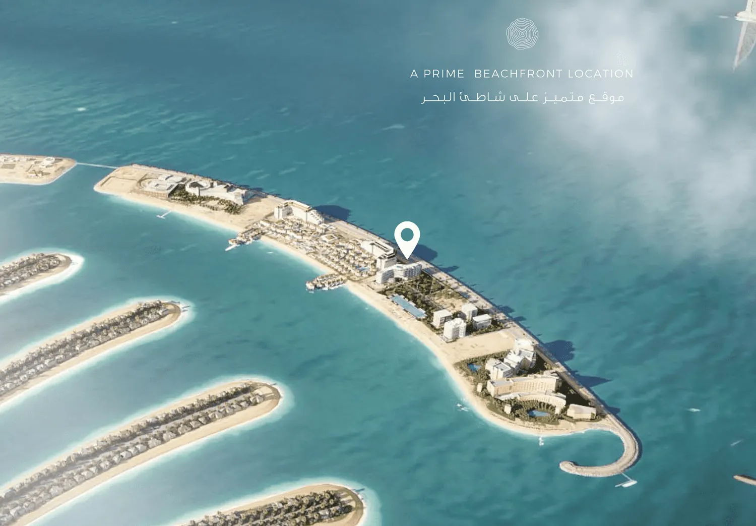 Palm Jumeirah is a luxurious community located on an artificial island that is shaped like a palm tree, with a trunk, fronds, and a crescent-shaped breakwater that surrounds the island.
