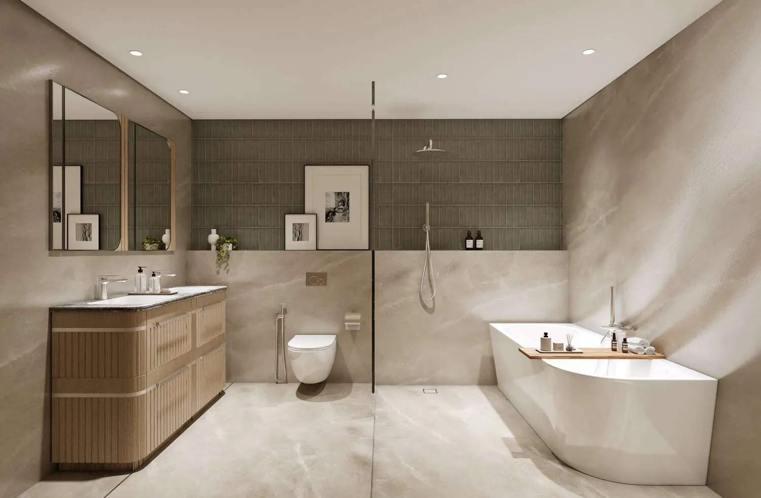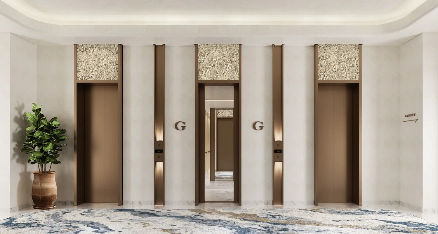 The grandeur of the entrance lobby is finished by a melange of textured surfaces, with the panoramic view outside framed by sheer drapery and complemented by polished walls. The inviting interiors are a melody of stone and metal accents, featuring tiles, wood finishes, and textured glass. An mix of high quality stone, wood, fabric, and metal elements enhances both visual and tactile experiences in every room whilst emphasising sophisticated elegance, tranquillity, and the intimacy of one’s personal space.