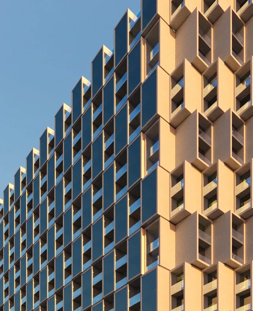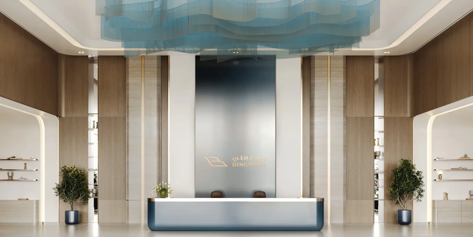 The architecture of the complex is defined by Binghatti’s signature clean lines and geometric forms, creating a modern, recognizable silhouette that blends harmoniously with the surrounding landscape. The interiors are designed in a contemporary style, utilizing high-quality materials to ensure a luxurious and comfortable living experience.