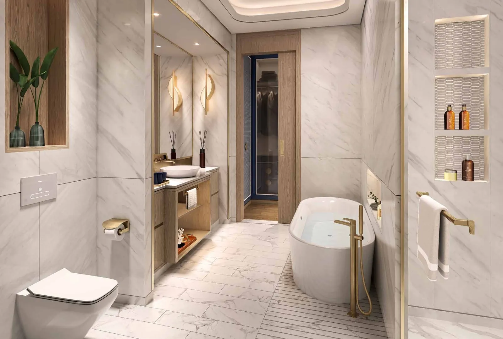 The interiors are painted in beige and blue shades to match the Dubai Maritime City’s theme and inspired by the love for the sea. Combined with unique décor elements, they will immerse future residents in an ambiance of a world-class cruise. The stylish interiors were created in collaboration with De Grisogono that became famous for its extravagant jewellery.