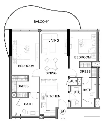 Marvel at sleek, curved exteriors by the lagoon, where Mediterranean living meets luxury amidst serene water features and greenery, with sweeping balconies seamlessly blending indoor and outdoor spaces.