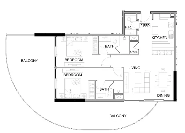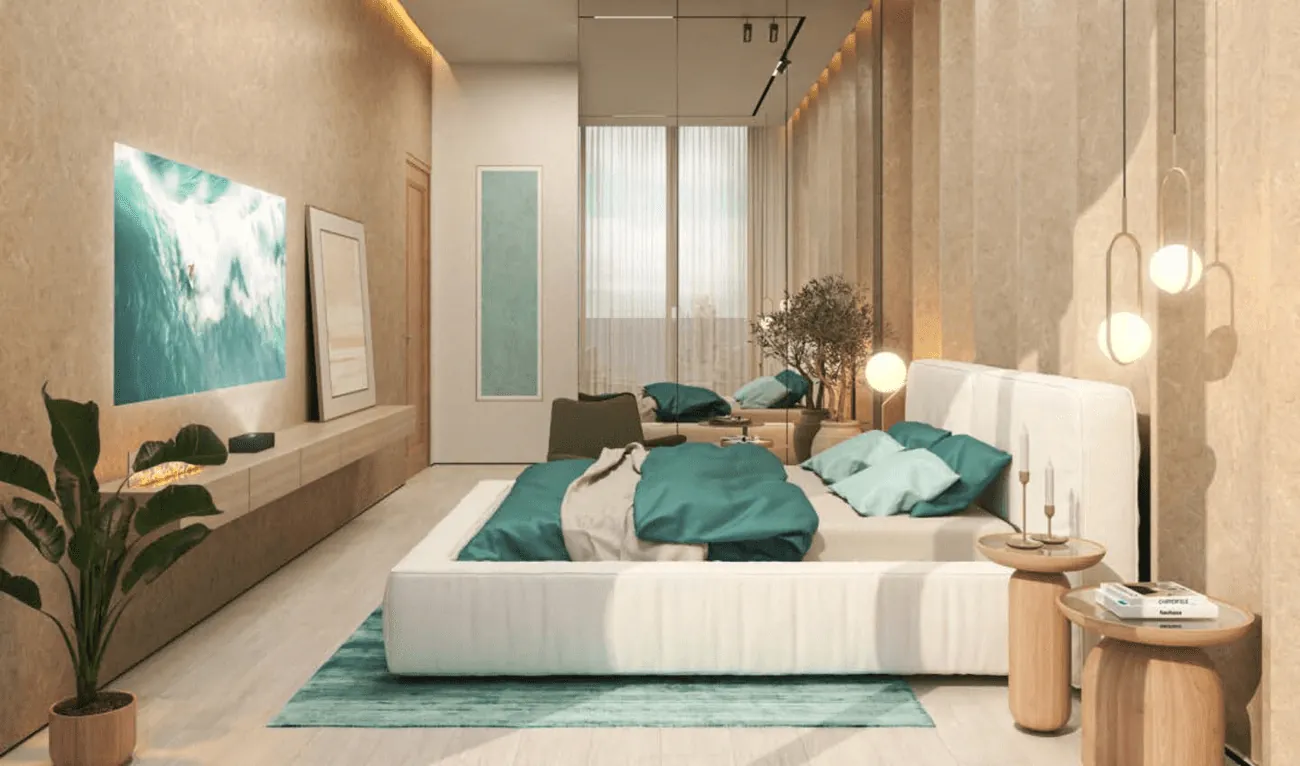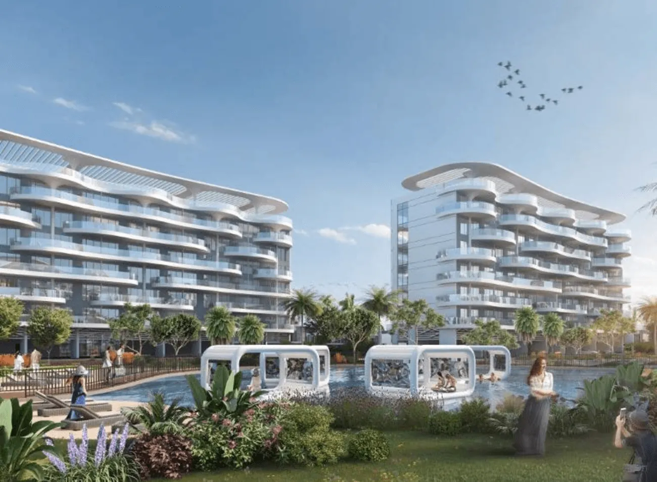 Marvel at sleek, curved exteriors by the lagoon, where Mediterranean living meets luxury amidst serene water features and greenery, with sweeping balconies seamlessly blending indoor and outdoor spaces.