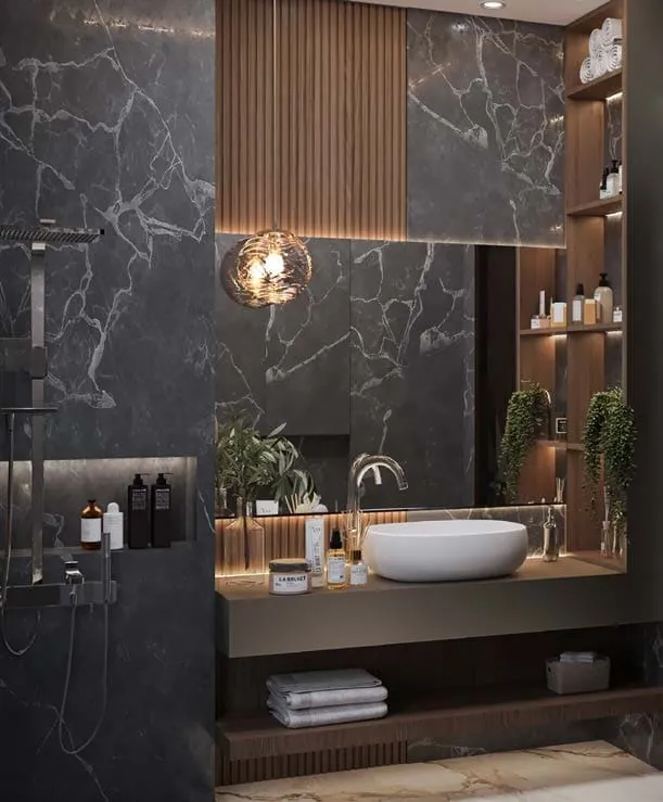 MR-MDR-UV high gloss finish kitchen cabinets. Anti-scratch, non-absorbent Quartz stone kitchen counter top. High gloss finish. Porcelain. Vitrified floor tiles. Fenomastic silk finish paint. Furnished Interiors. Styrolene textured paint. Built-in gas hob, chimney and microwave. Bohemian glass crystal finish chandeliers