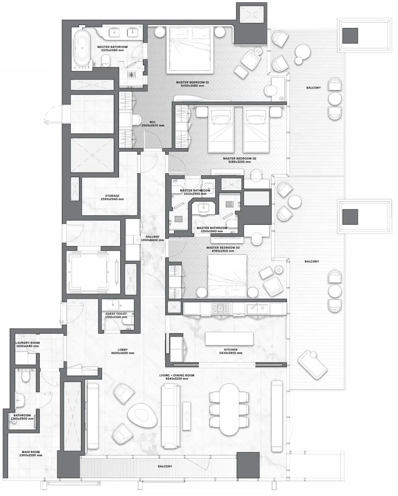 The design of the Interiors has been meticulously designed by Horacio Pagani to bring out the designs and qualities and the spirit of the Pagani car. Horacio wanted to bring to the world the only 83 Pagani residences with interiors that are second to none. The floors are covered with marble while the kitchen counter and the guest bathroom are not only covered with the beautiful black zebra marble, but the pieces are brought together to continue the lines and the designs, so it fits beautifully and tells a story. This is not to mention the high-end Italian Sanitary ware from Gessi across all the kitchen and bathrooms of these apartments and the walls covered with ribbed oak charcoal-stained wood or wallpaper.