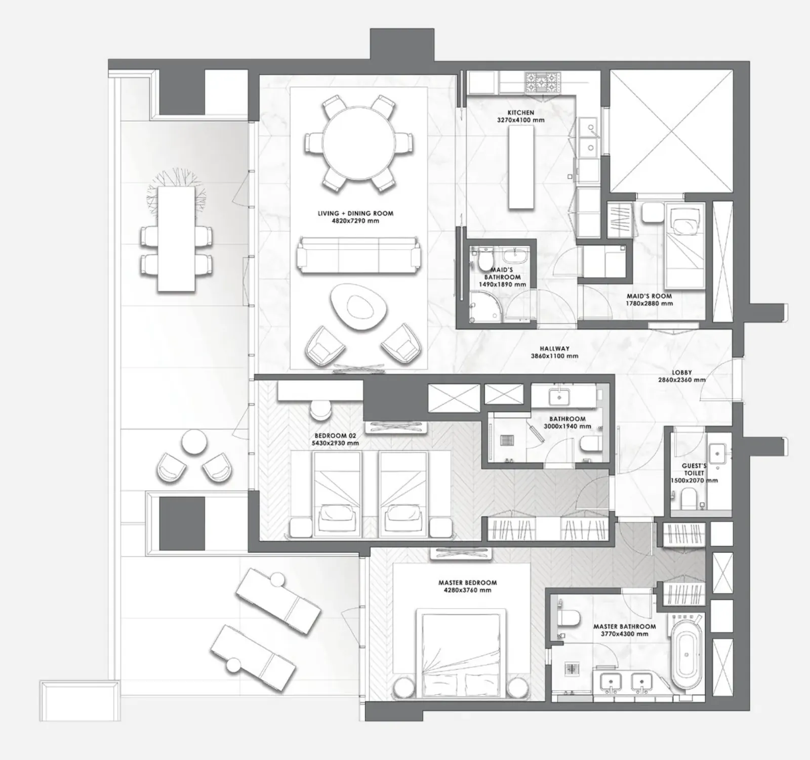 Bathrooms: Marble flooring and skirting, Marble / wallpaper walls, Moisture resistant gypsum ceiling finished with paint, Marble counter top, Lacquered / Veneer joinery, Gessi, Newform or equivalent sanitary fixtures Kohler, Duravit, Geberit or equivalent sanitarywre