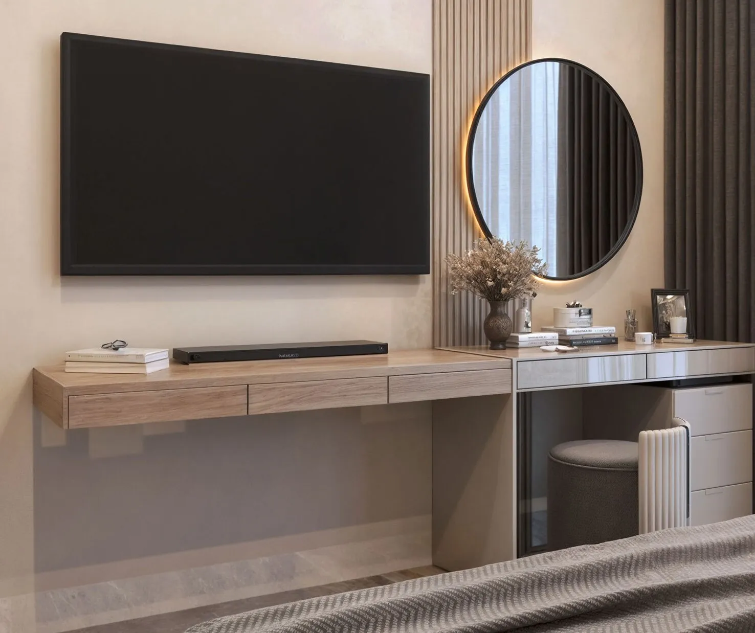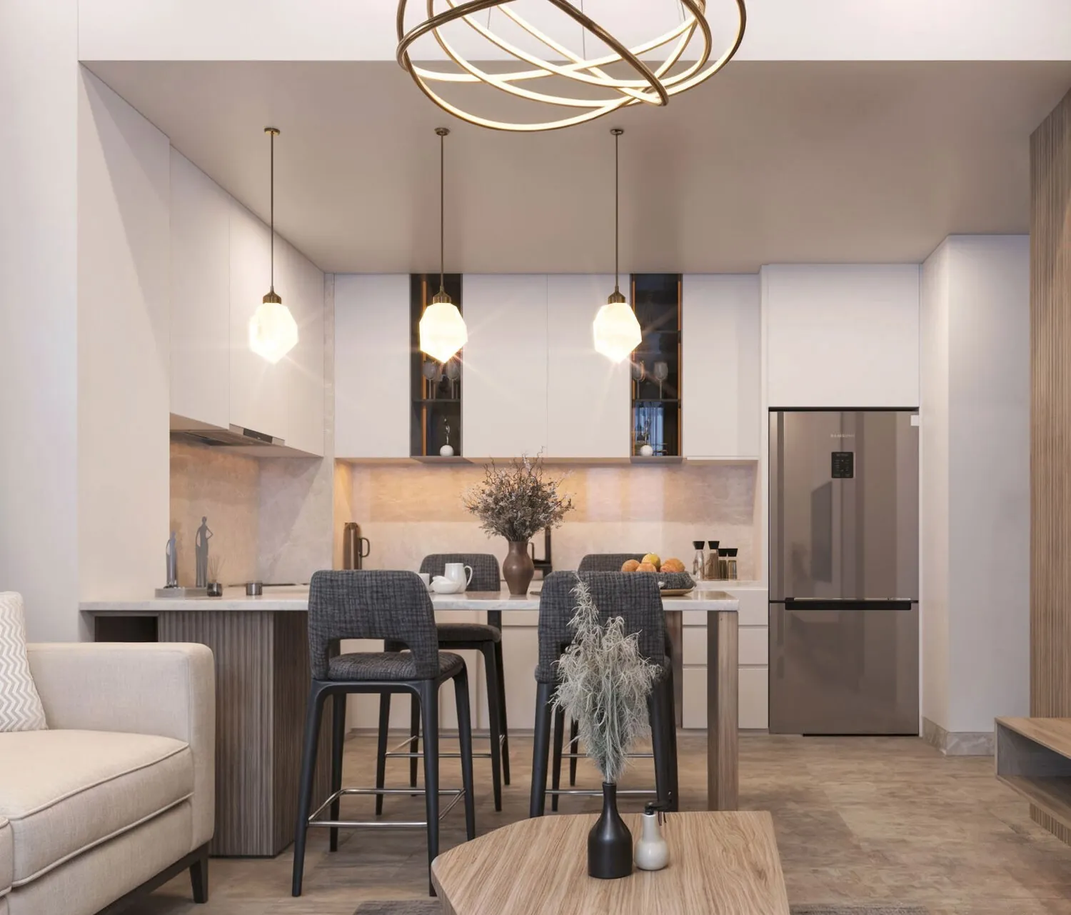 Modern finishing with high-quality materials like marble, granite, or wood.