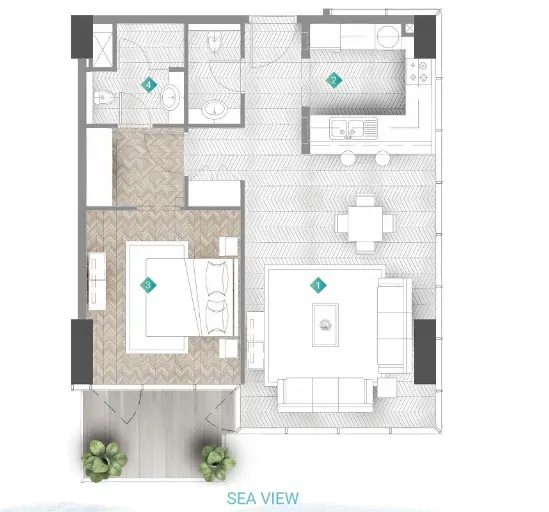 The building's layout is designed around a single loaded corridor, which allows for an unobstructed view of the sea. Each apartment features a spacious, 2.4-meter-wide continuous balcony, providing ample outdoor living space.