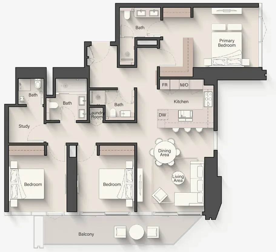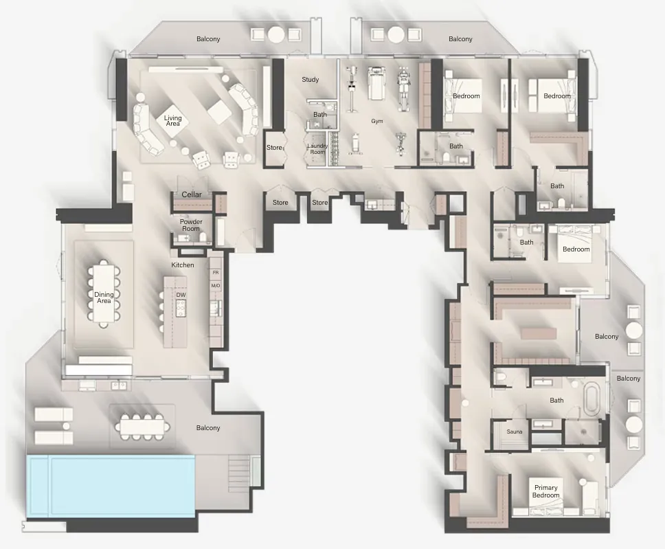 Residents of Towers 1 & 2 enjoy an exceptional array of lifestyle amenities distributed across multiple clubhouse levels — from wellness to social connection. The project features multiple swimming pools, bubble therapy pools, sun loungers, padel courts, indoor and outdoor fitness zones, and yoga platforms. Families benefit from kids’ pools, outdoor play areas, and dedicated game rooms, while adults can relax across spa suites, steam and sauna facilities, retreat lounges, cinema rooms, dance studios, and co-working clubs. Ground-level features such as retail, F&B terraces, community lake paths, pet areas, and courtyards complete a holistic community experience.