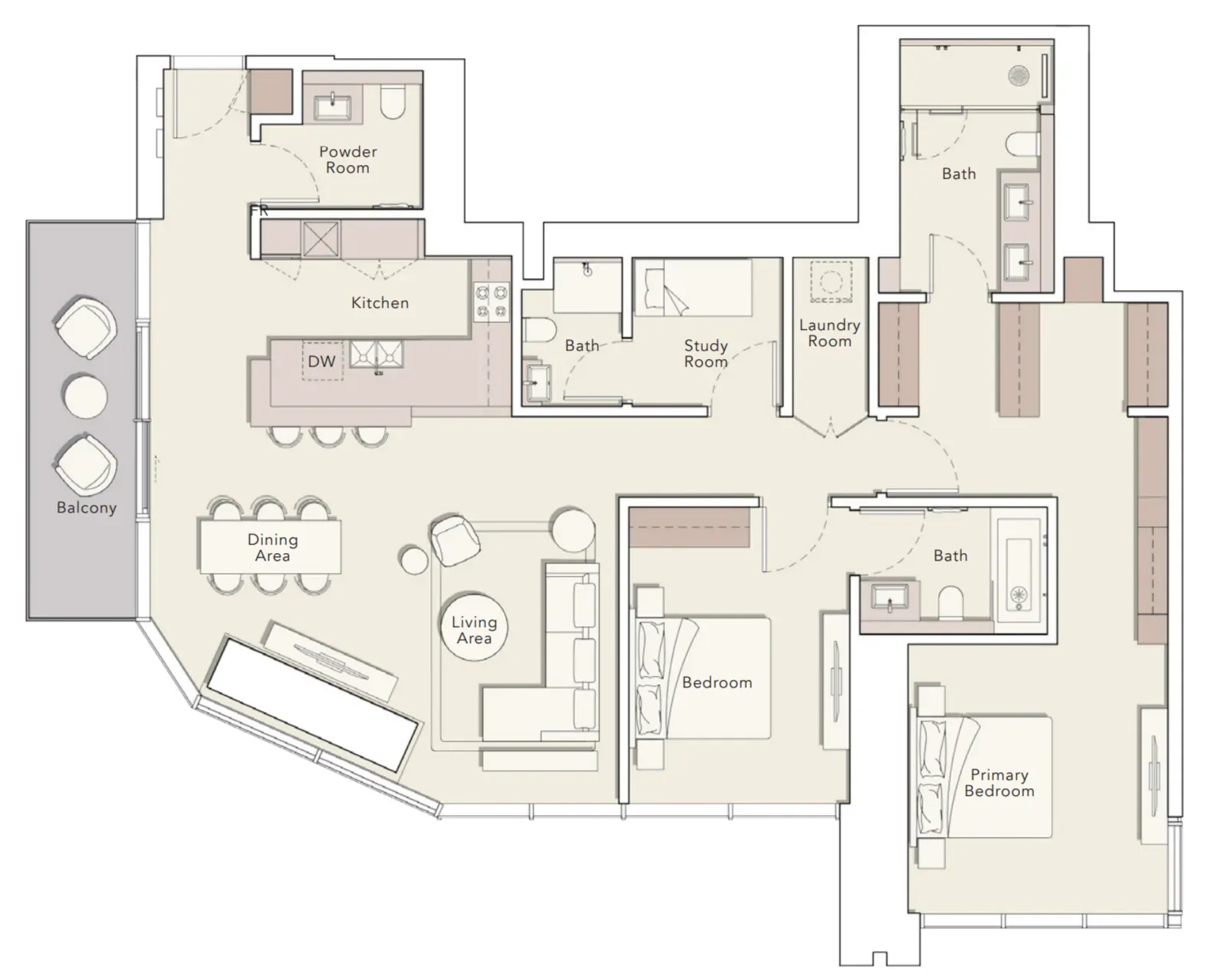 High-end detailing with a contemporary edge retains the effortlessness of the building’s striking facade. Warm finishes and intricately applied detailing set the scene for self-care and relaxing cleansing rituals.