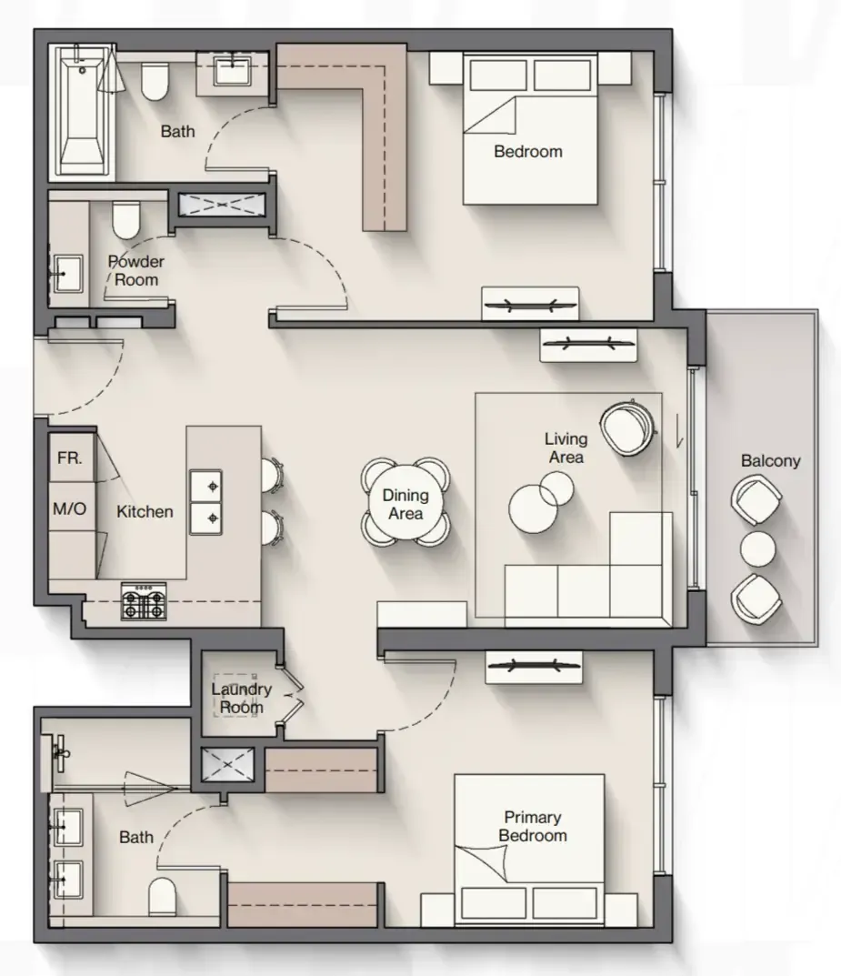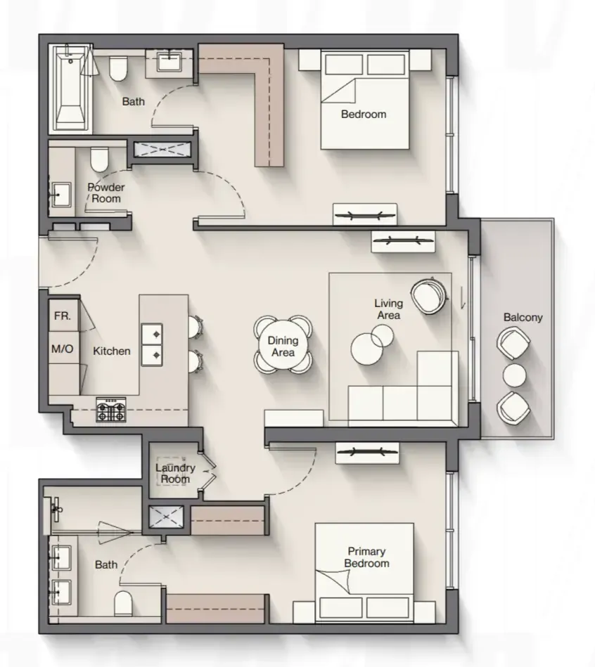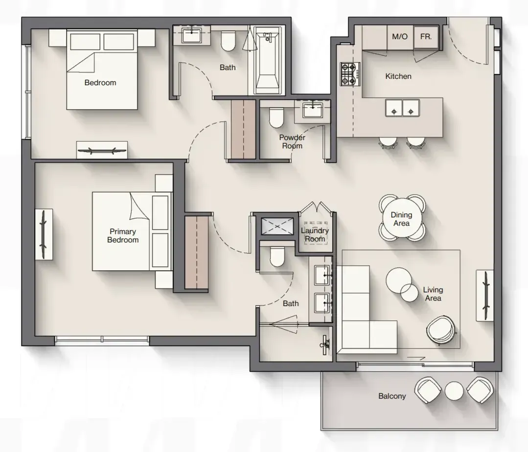 The interiors are crafted with modern elegance and natural harmony. From cozy studios to spacious three-bedroom layouts, each apartment is designed for seamless everyday living, enhanced by abundant natural light and a sense of spatial fluidity. High-quality finishes, practical layouts, and contemporary design come together to meet the diverse needs of individuals, couples, and families.