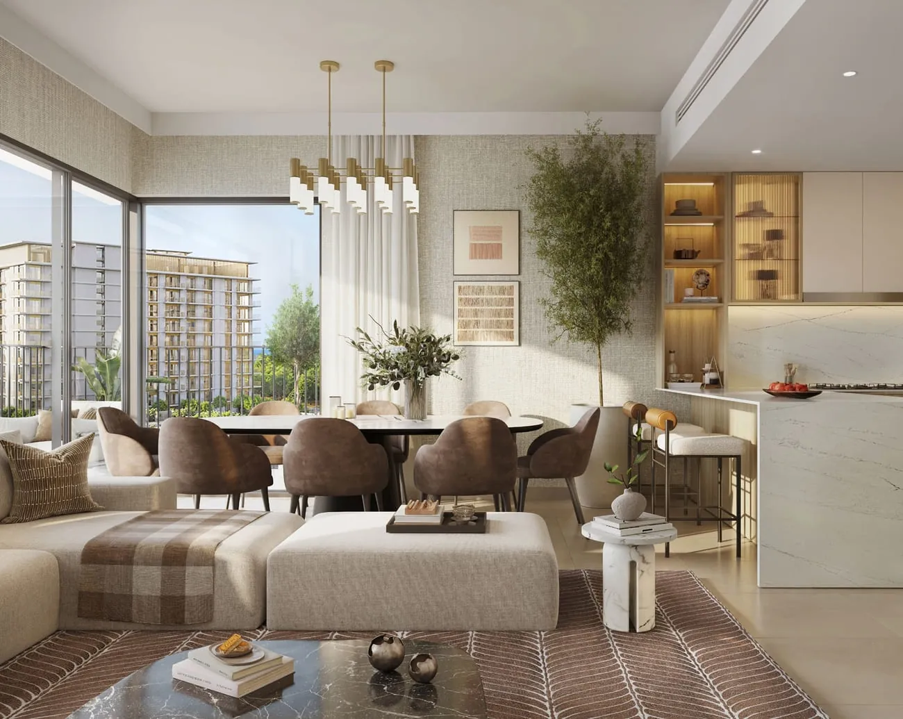 Designed to please, the overall architecture plays with space, light, and texture to craft a symbol of modern abode. Its earthy-toned façade and soothing palette create a warm and inviting ambience. Floor-to-ceiling windows welcome golden sunrises, while shadowed alcoves offer pockets of quiet retreat. Discover 1 to 3 bedroom apartments and exclusive 3 bedroom townhouses, where sleek design meets timeless charm, with expansive interiors and stunning views of the Emaar South Golf Course.