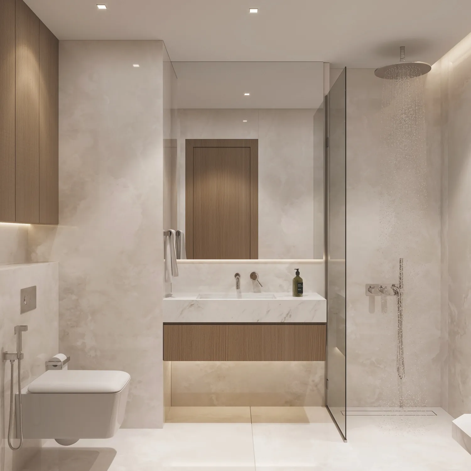 Equipped kitchen with SIEMENS (or equivalent). Сabinets and storage units crafted from premium matte-finished melamine, complemented by high-quality hardware from Häfele (or equivalent). The countertop is made of luxurious Italian premium artificial marble, adding a touch of elegance. To complete the setup, the sink and faucet are from GROHE (or equivalent), ensuring top-notch functionality and style.