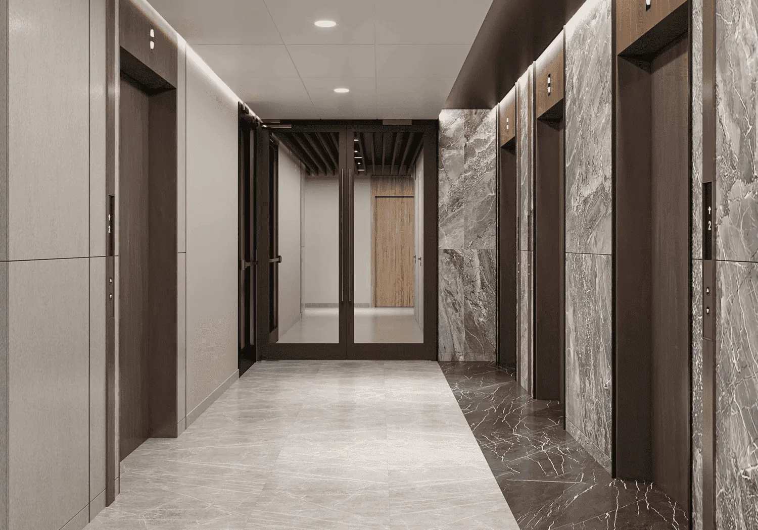 The ground floor of the residential building features a welcoming lobby reception area with a separate waiting area for couriers and service staff. Additionally, there is a convenient coffee shop, enhancing the overall experience and convenience for everyone.