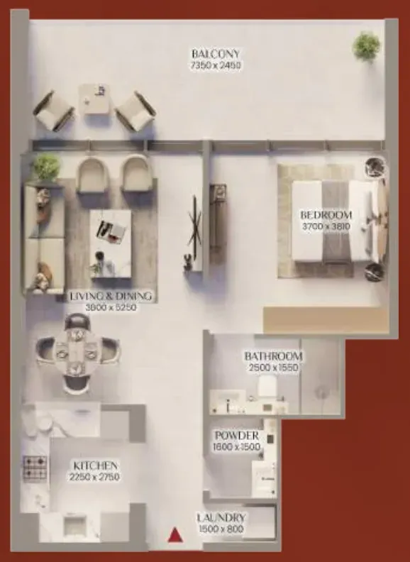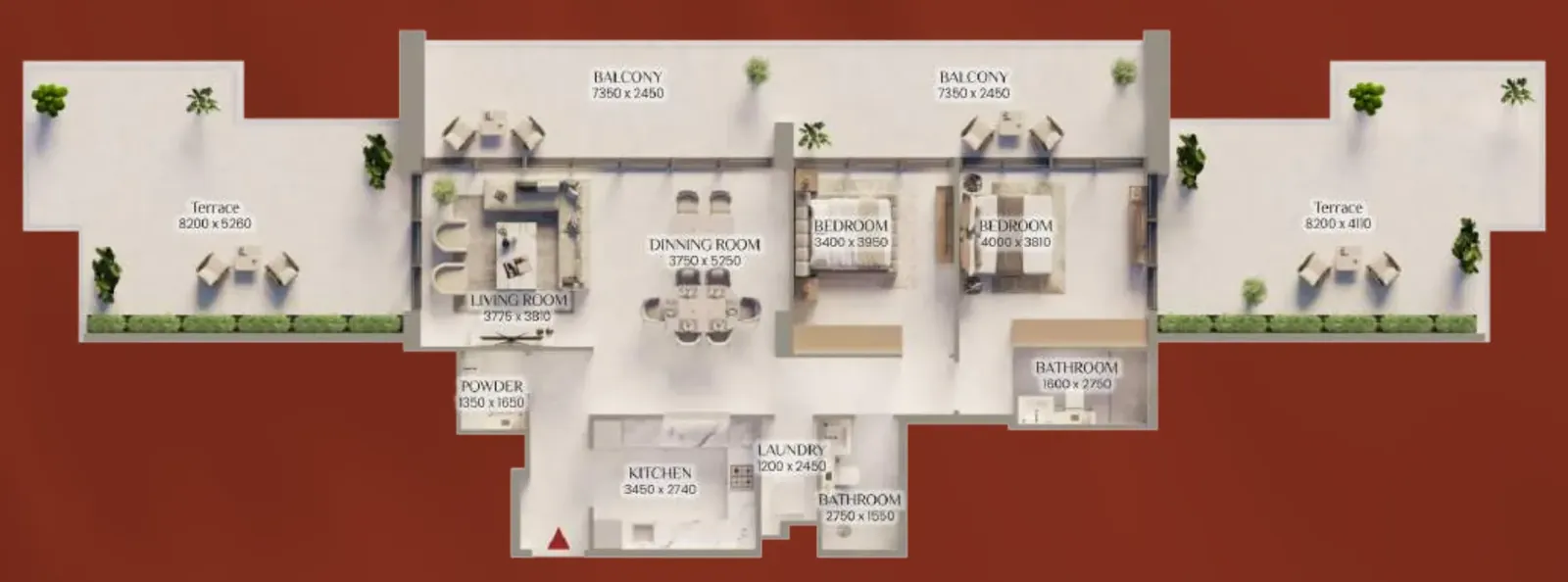 Apartments come fully furnished: soft seating, designer decor, dining tables for 4 or 6 depending on the unit type. Wardrobes are equipped with shelves, drawers, and hanging space. Balconies are also furnished with stylish outdoor furniture.