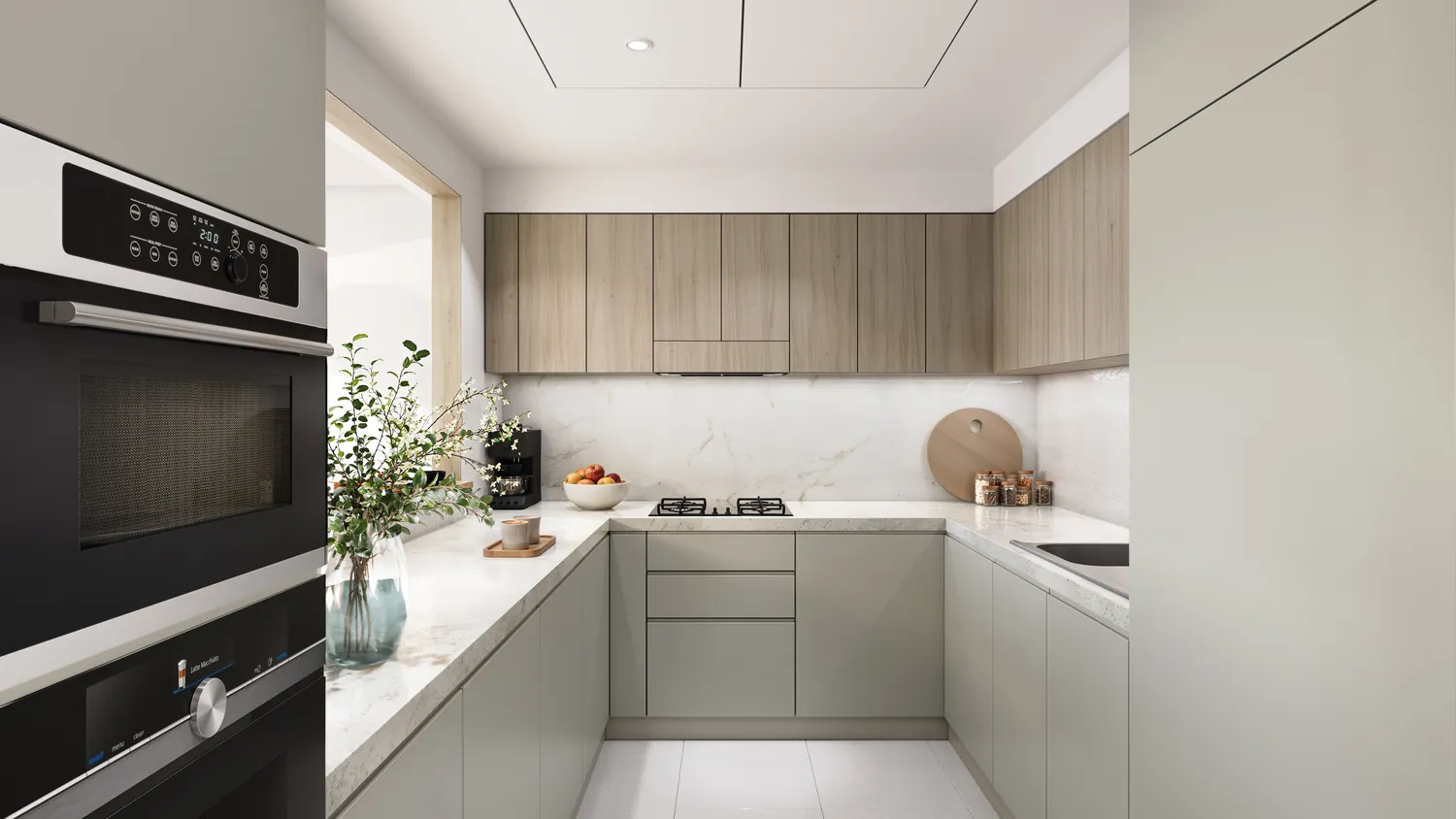 Kitchens are fully fitted, with laminate cabinetry and stone countertops. Equipped with Electrolux appliances: cooktop, oven, microwave, range hood, and refrigerator. A washer-dryer unit is also included.