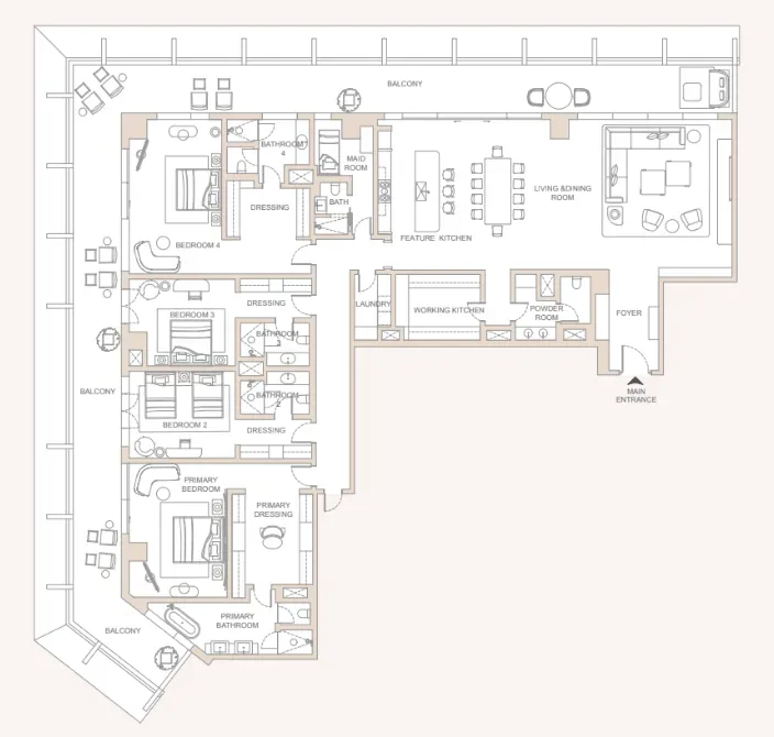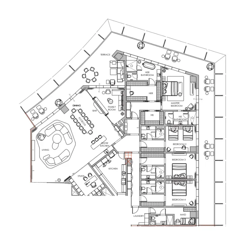 The 50 residences and 2 penthouses at Private Residences DIFC are majestically perched on floors 2 to 21, commanding a breathtaking panorama over the city. Each of these exclusive residences is an escape toweard refined luxury, a promise of space, privacy, and serenity that transcends the ordinary. The interiors, masterfully crafted by the artisans at Tihany Design, speak a language of intimacy, bespoke craftsmanship, and a deep connection to the very soul of the destination.