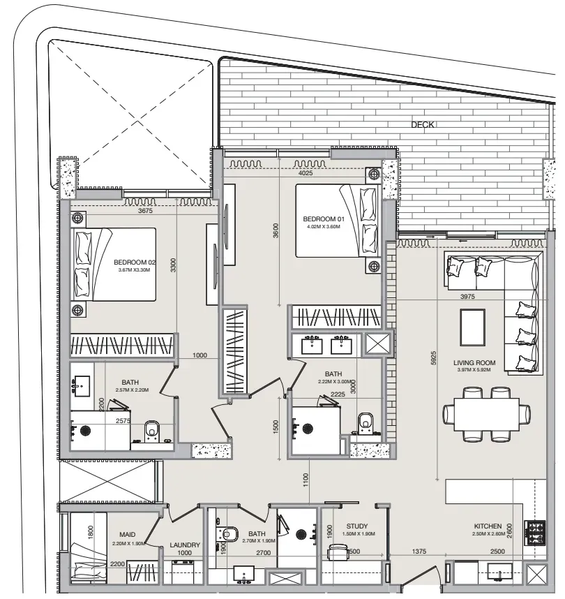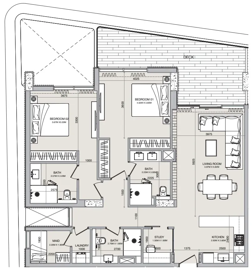 Semi-furnished apartments with built-in wardrobes.