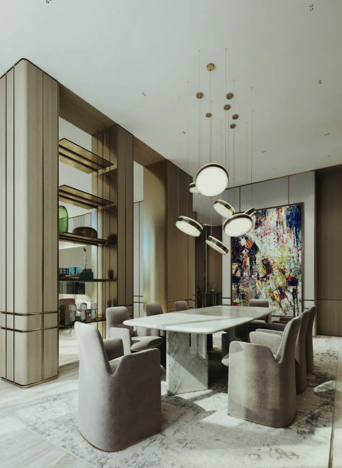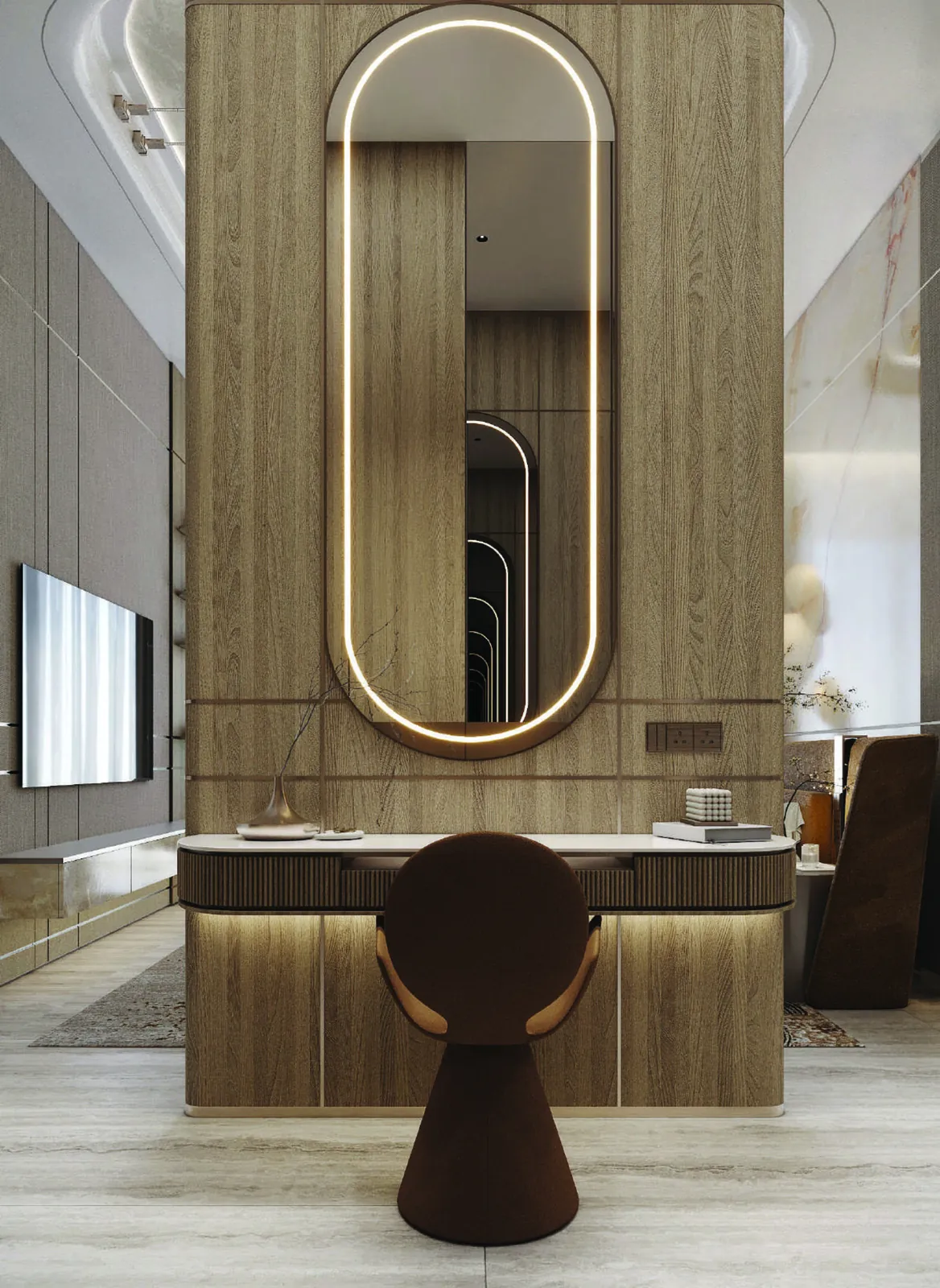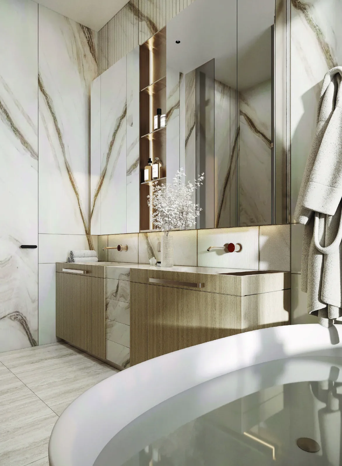 Modern finishing with high-quality materials such as stone, wood, and artisanal plaster. Living areas and bedrooms are finished with high-quality natural materials, including wooden cladding, textured plaster, and marble accents.