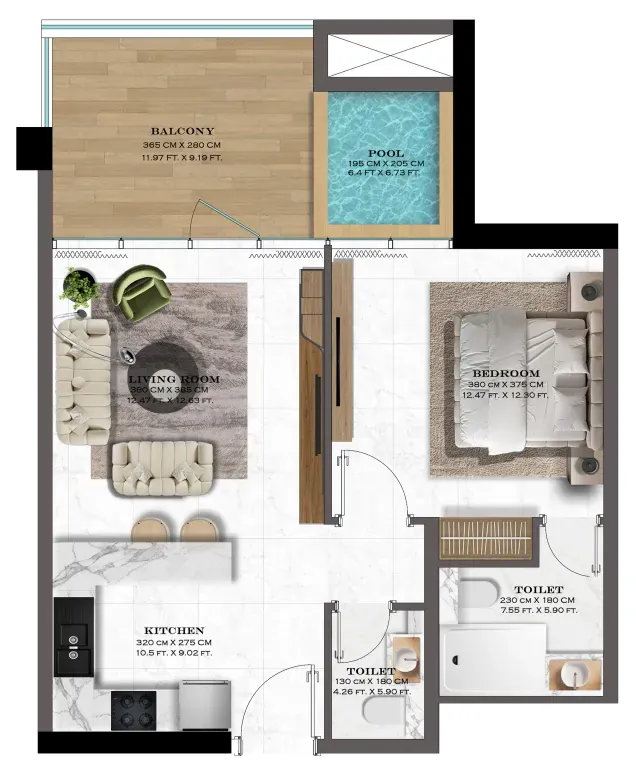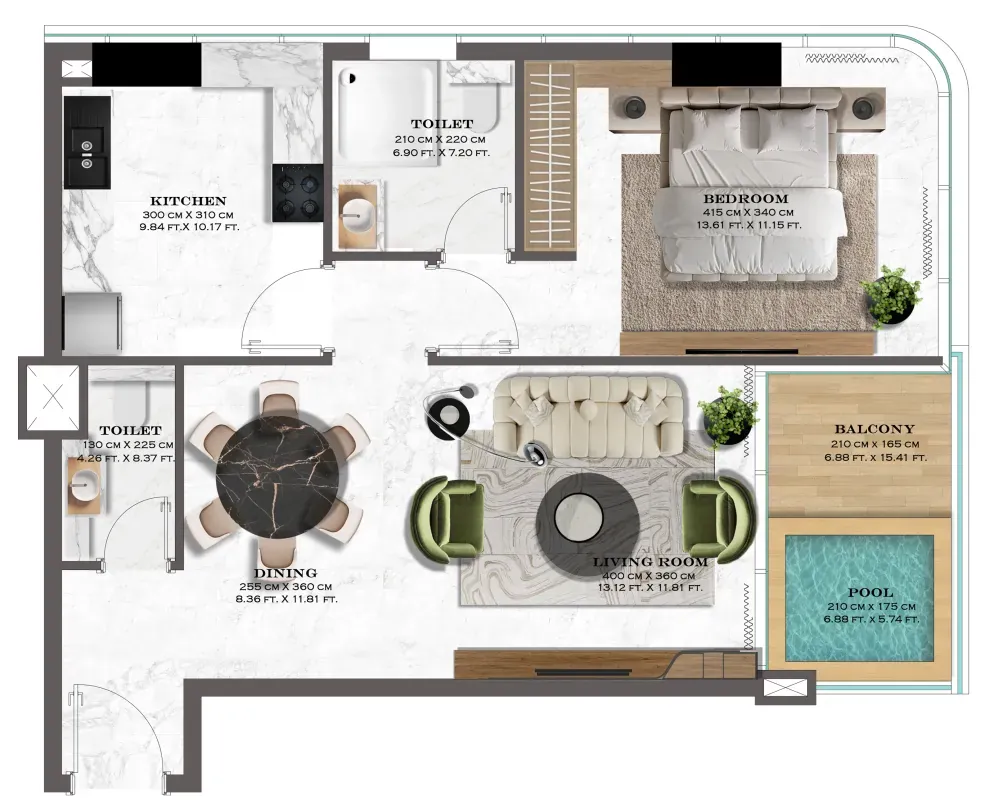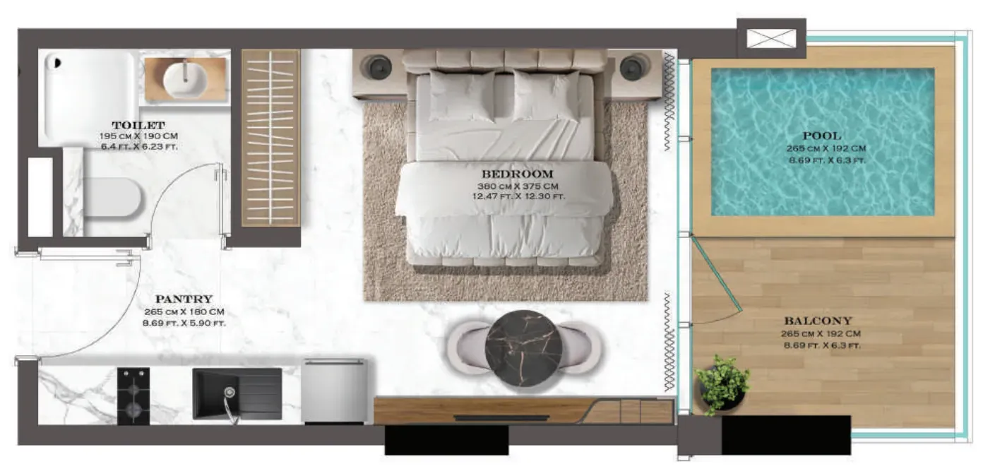 The apartments at Lazord are designed to offer both comfort and elegance. Spacious layouts, carefully selected finishes, and expansive windows fill the homes with natural light, creating a serene atmosphere throughout. With options that include private swimming pool units, the interiors reflect a high standard of craftsmanship — ideal for modern lifestyles seeking both style and functionality in everyday living.