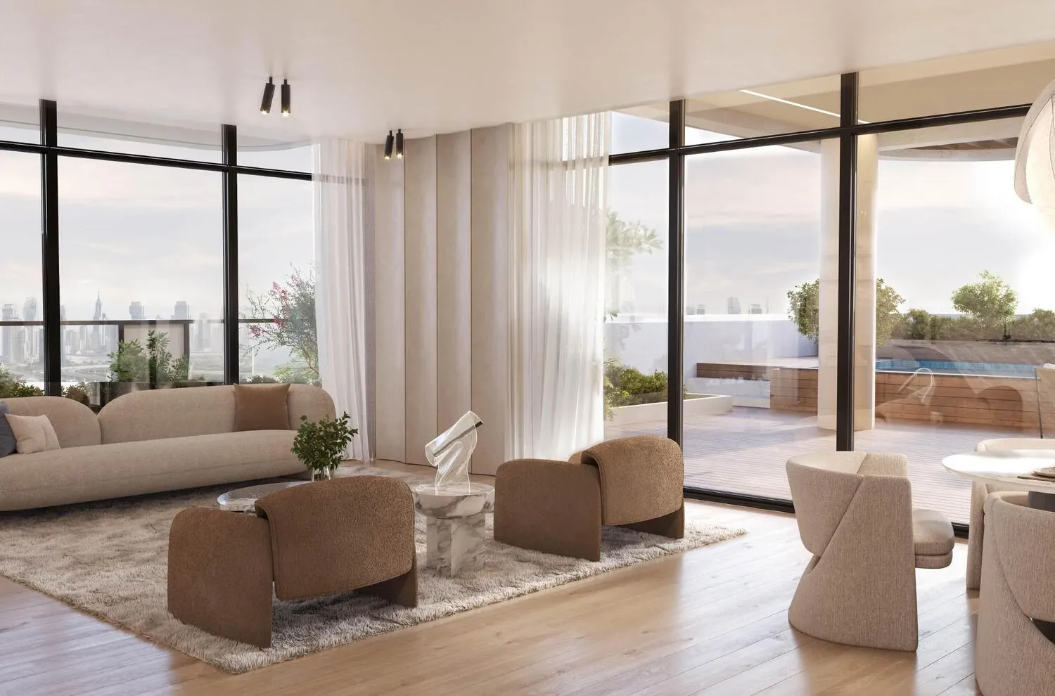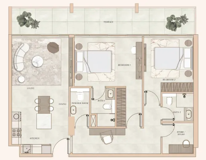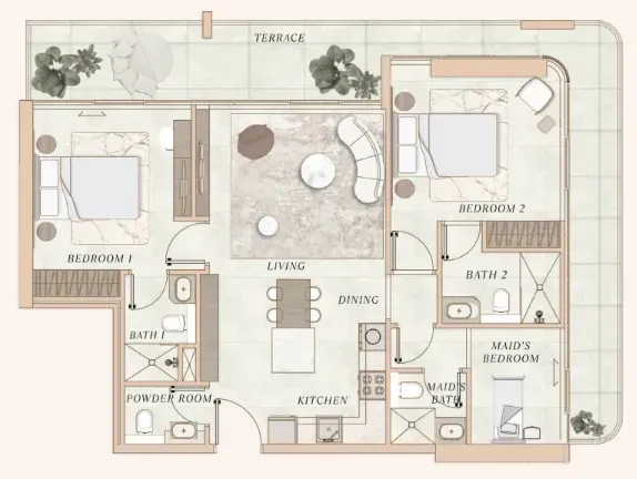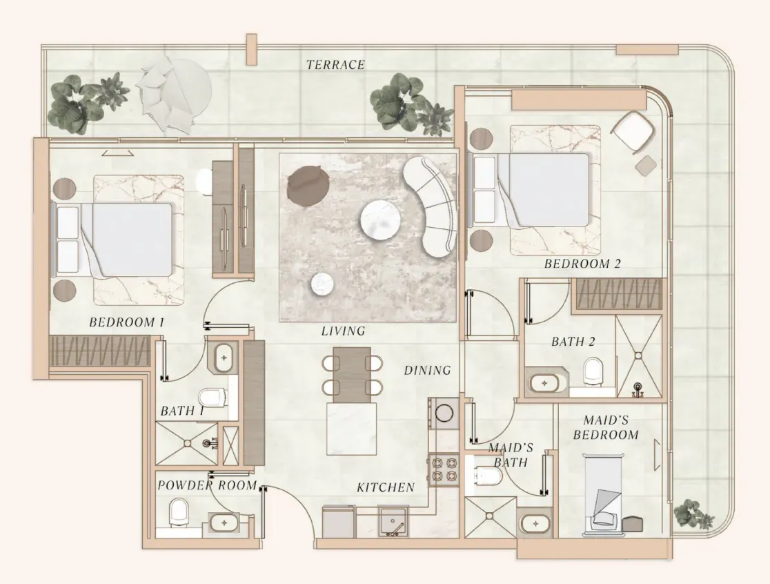 Premium finishes and a warm, modern palette.