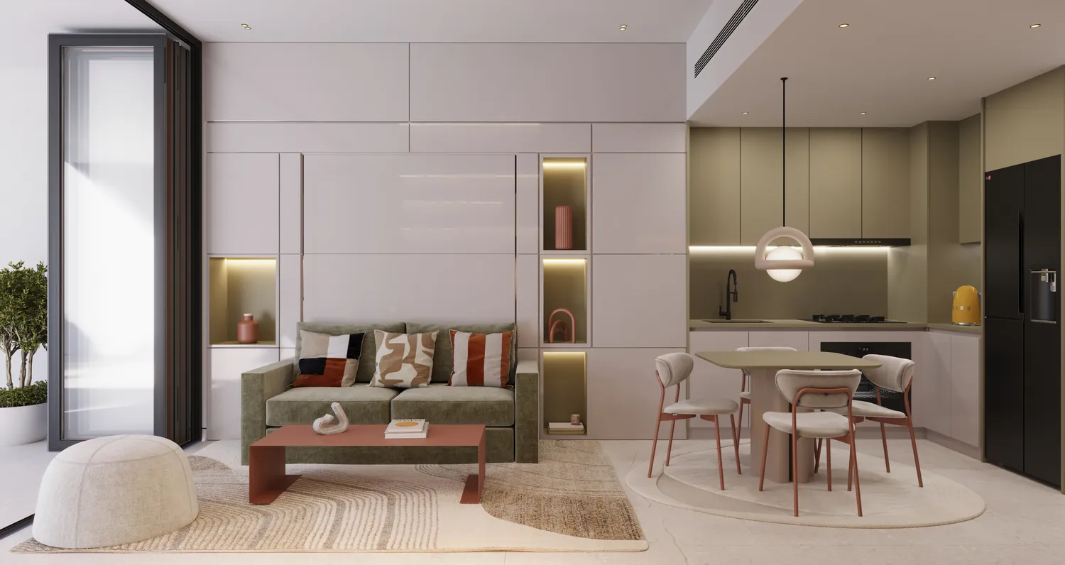 The project features a dynamic selection of fully furnished studio, 1-bedroom, and 2-bedroom apartments with flexible layouts, modular furniture, and convertible living zones. Designed for a new generation of residents, these homes seamlessly balance functionality and comfort. Bright interiors, intelligent storage solutions, and open-plan designs ensure every space adapts to the rhythm of modern life — whether relaxing, entertaining, or working from home.