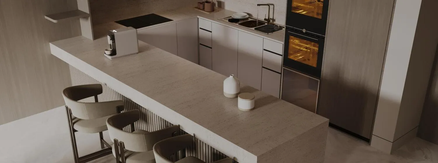 Equipped kitchens with appliances from Miele, Villeroy & Boch and Gessi.