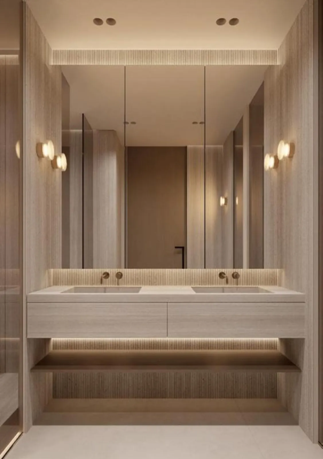 Modern finishing with high-quality materials such as warm woods, veined stone, brushed gold, and soft textures. Smart Home System and electronic solutions from Systeme Electric.