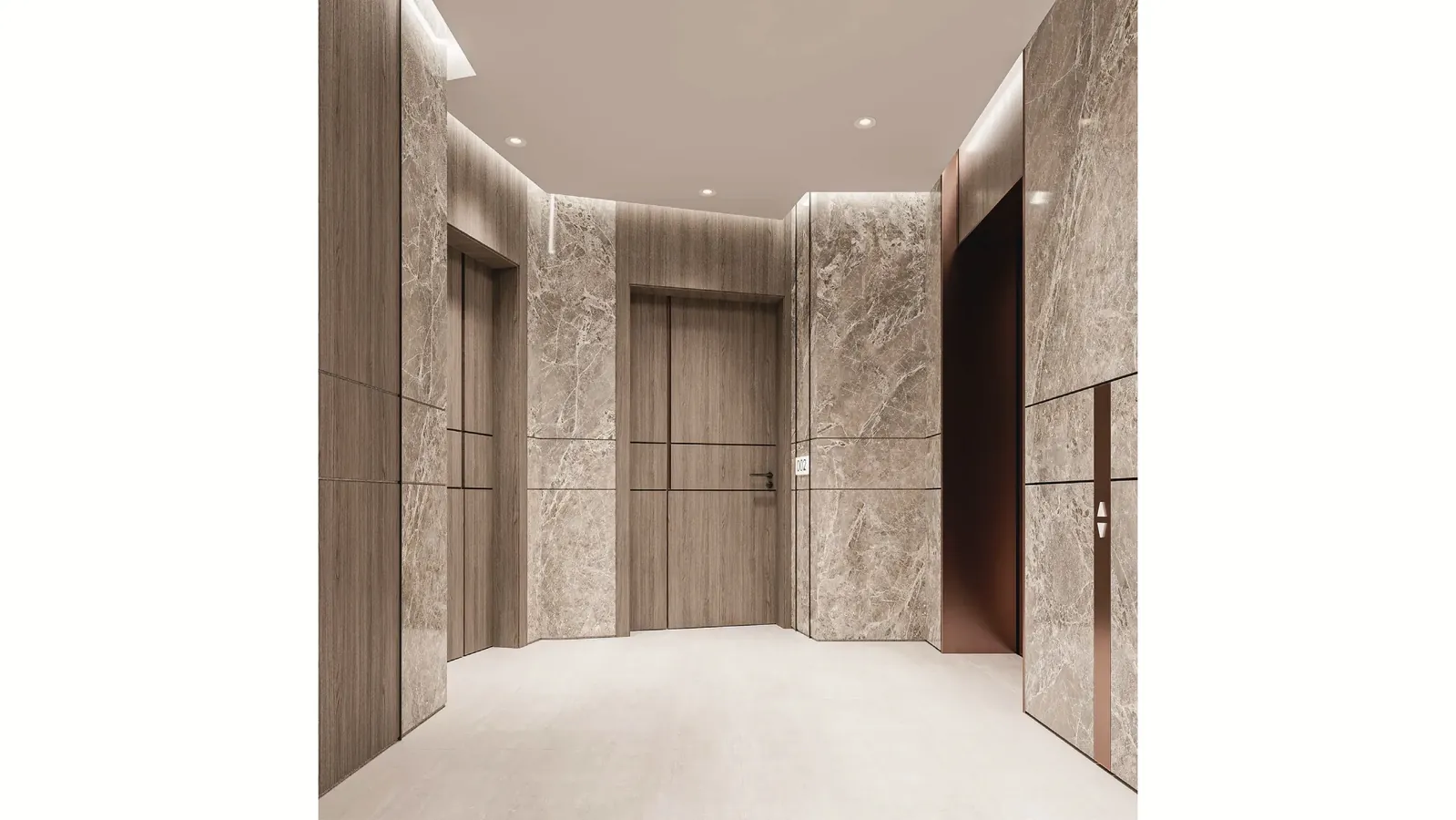 Floarea Breeze features premium European finishes and fittings. Living areas include decorative walls with wood-textured accents, while bedrooms come with built-in MDF wardrobes and dresser consoles. Kitchens are fully fitted with Bosch appliances and quartz countertops, complemented by porcelain backsplashes and high-quality European hardware. Bathrooms are equipped with sanitary ware from GESSI, LAUFEN, and IWW. Each home includes a Smart Home System powered by Alexa, with glass touch panels and digital climate control for effortless comfort.