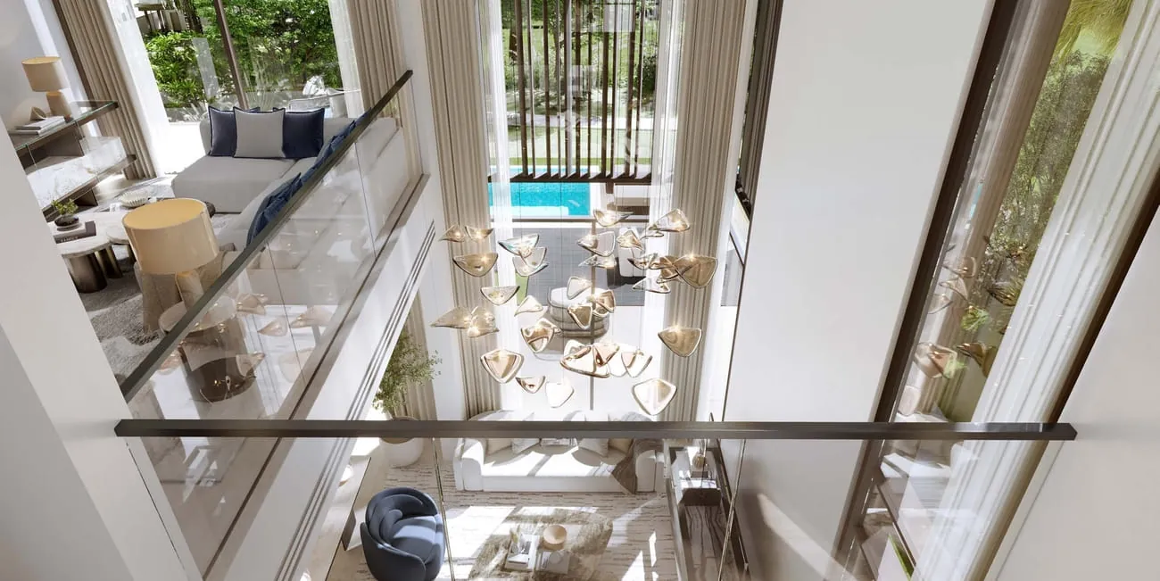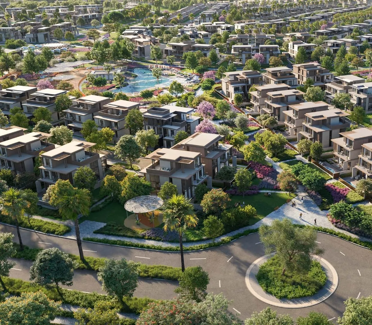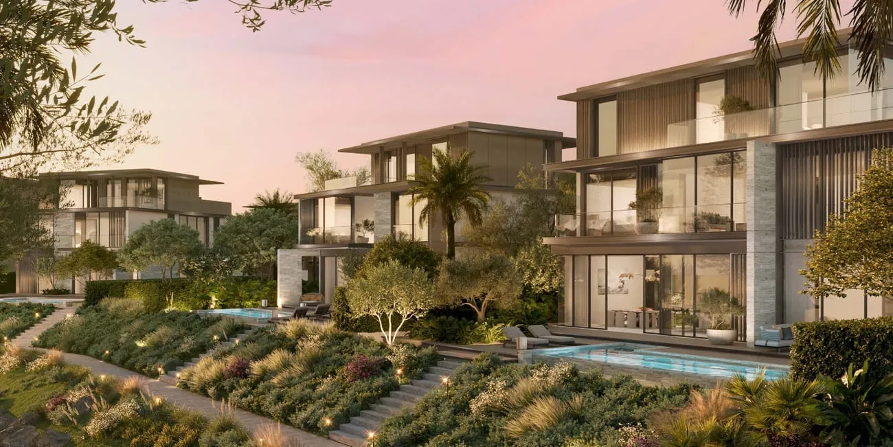 Modern finishing with high-quality materials. Luxurious townhouses with sleek exteriors featuring clean lines, articulated masses, bronze aluminum screens, and wide glass windows, they offer a sophisticated aesthetic while ensuring bright, inviting interiors with expansive double-height ceilings. The villas’ contemporary architecture, defined by the use of stone and aluminum screens, conveys a sense of luxury and sophistication while enhancing its overall aesthetic.