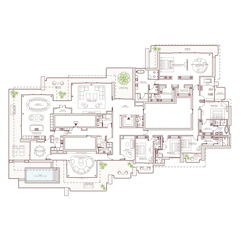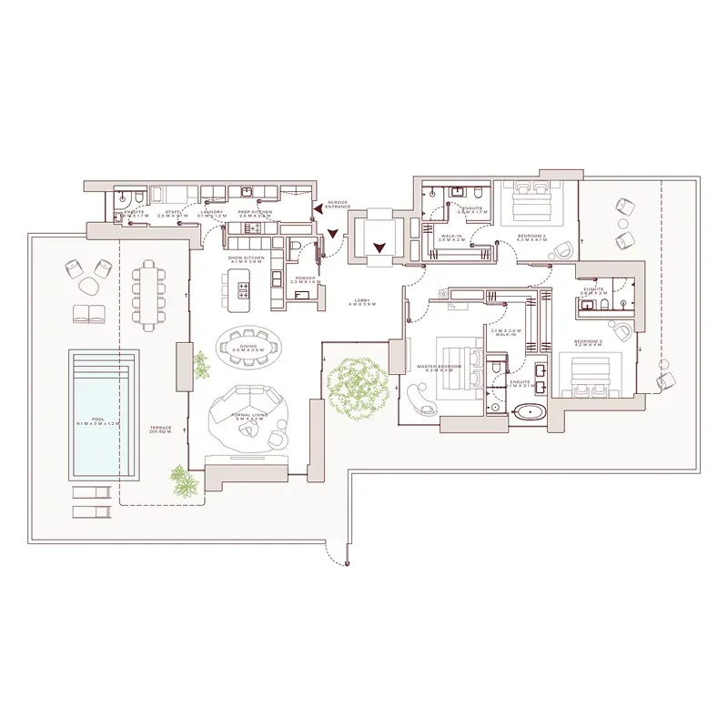 The residences include a refined collection of apartments, garden homes, duplexes, and penthouses, all finished with timeless interiors, natural materials, and expansive glazing. Private pools, serene courtyards, and panoramic terraces elevate the sense of home, while curated amenities — from a spa and wellness lounge to a fitness studio, cinema, and residents’ lounge — enrich daily living. Supported by concierge, valet, and bespoke à la carte services, Solaya reimagines beachfront living in Dubai as a seamless blend of sophistication, privacy, and resort-style comfort.