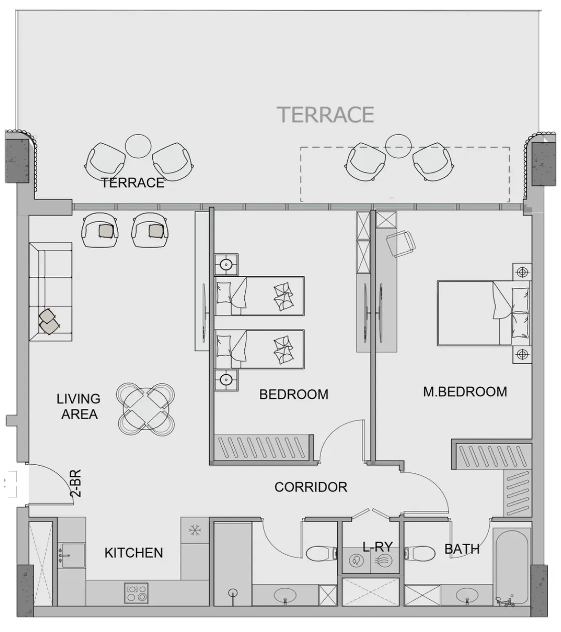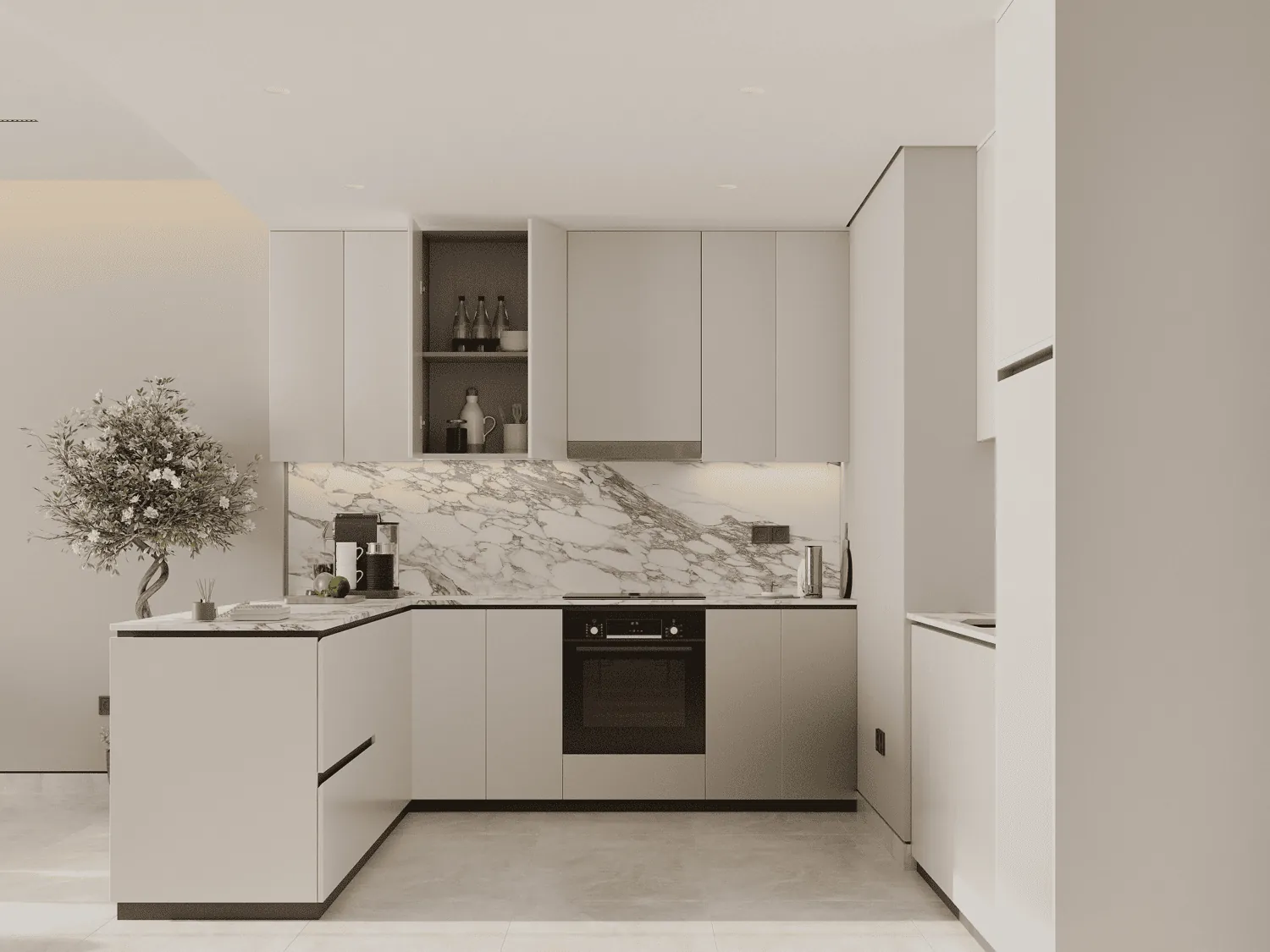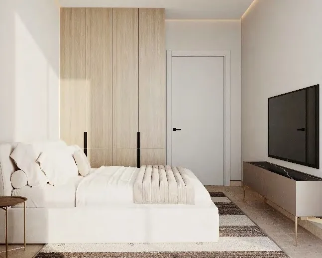 The apartments are fully finished using modern, high-quality materials, providing a luxurious and refined living experience. In the living room, the floors and skirting feature porcelain tiles with a matte finish. The ceilings are painted white, and the doors and cabinet doors are finished in durable laminate.