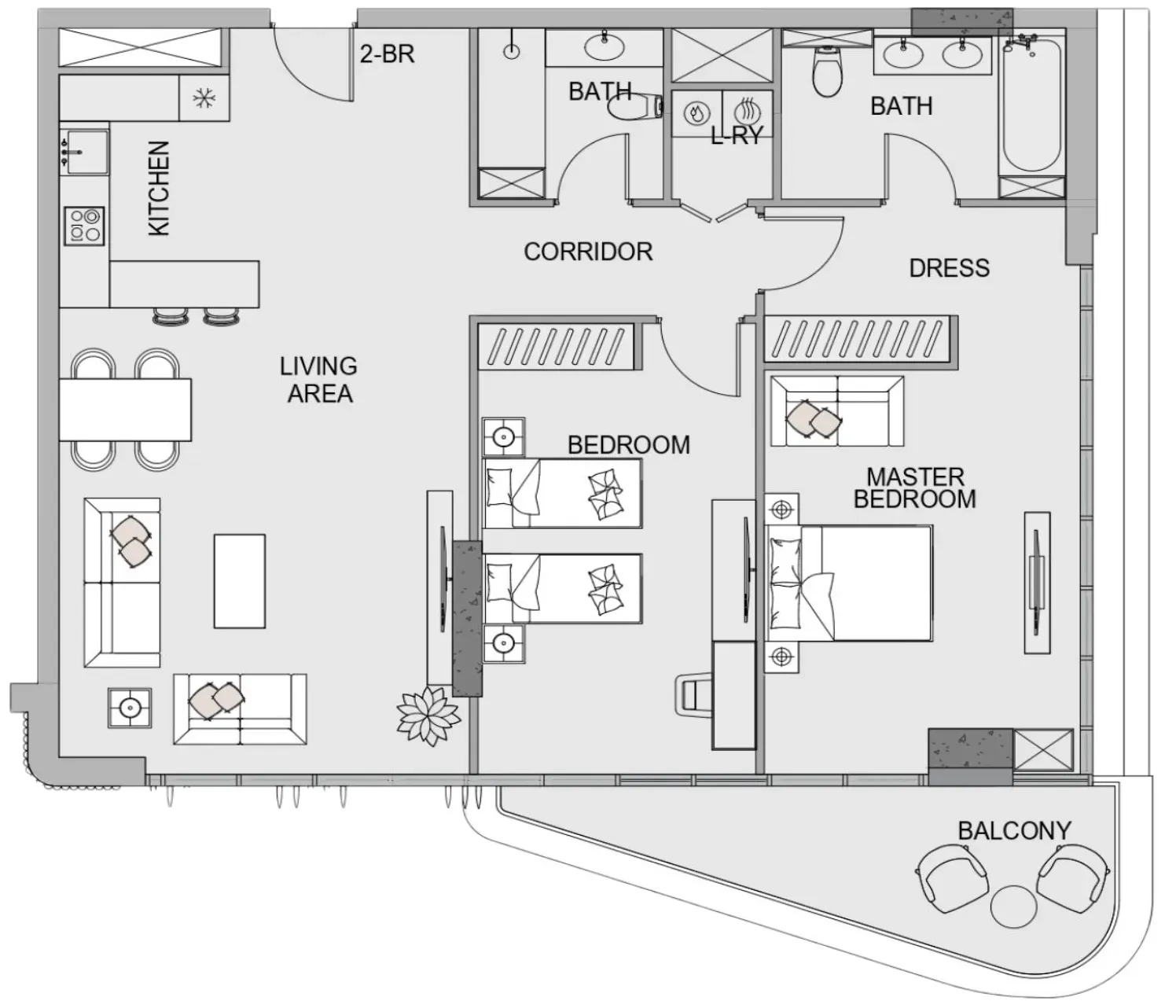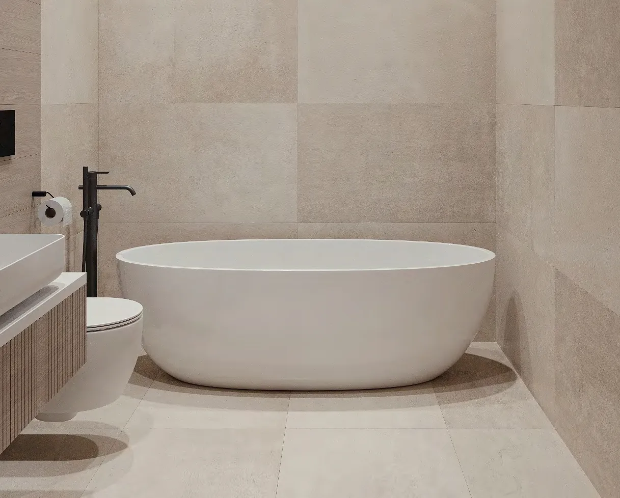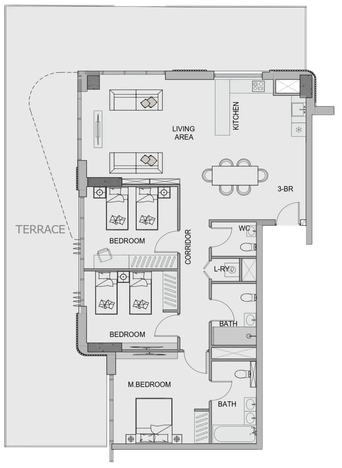 The apartments are fully finished using modern, high-quality materials, providing a luxurious and refined living experience. In the living room, the floors and skirting feature porcelain tiles with a matte finish. The ceilings are painted white, and the doors and cabinet doors are finished in durable laminate.