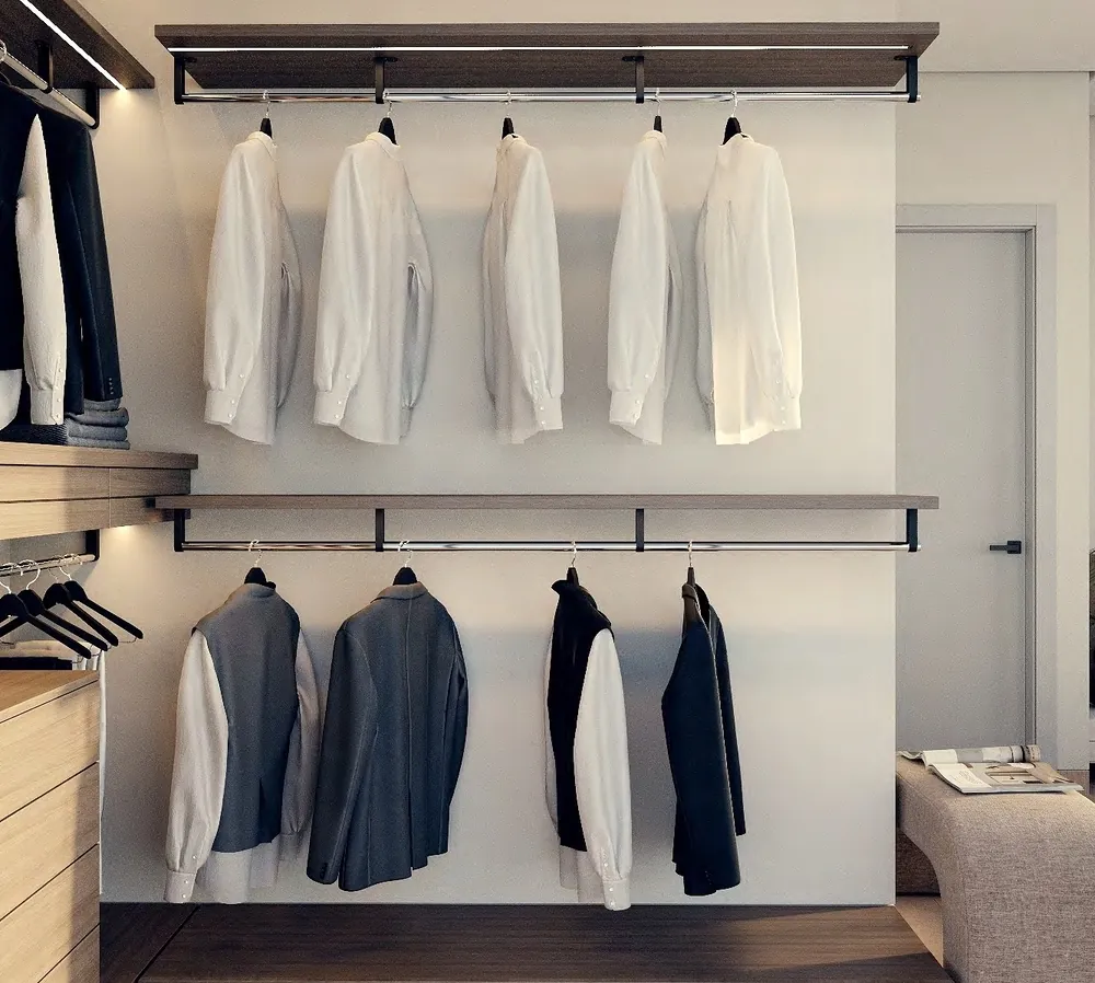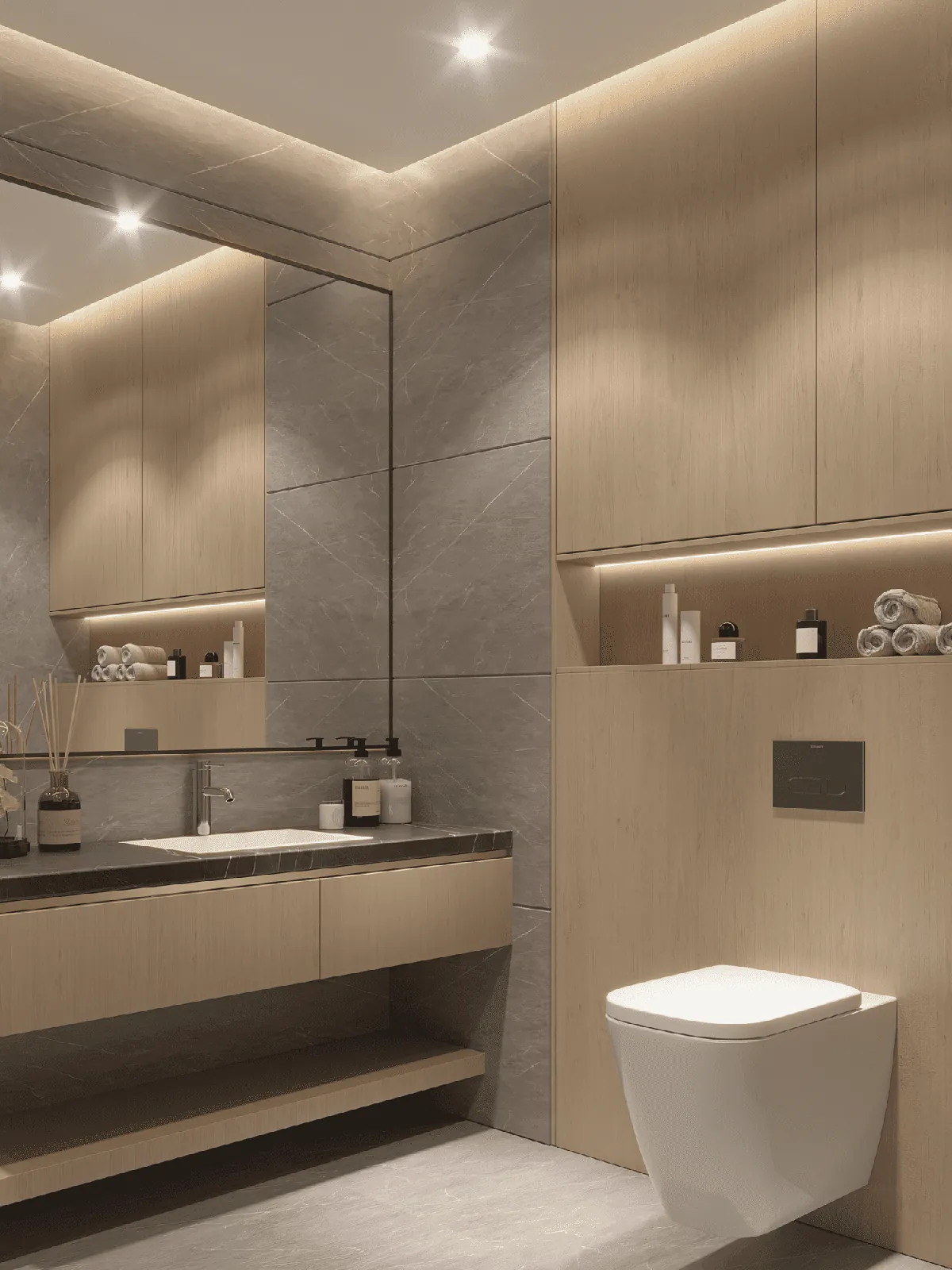 The bathroom is fitted with Armani grey porcelain tiles and laminate HPL vanity countertops and doors. The wardrobe is crafted from laminated MDF wood, with porcelain tiles for both the walls and floor, creating a sophisticated and elegant environment.
