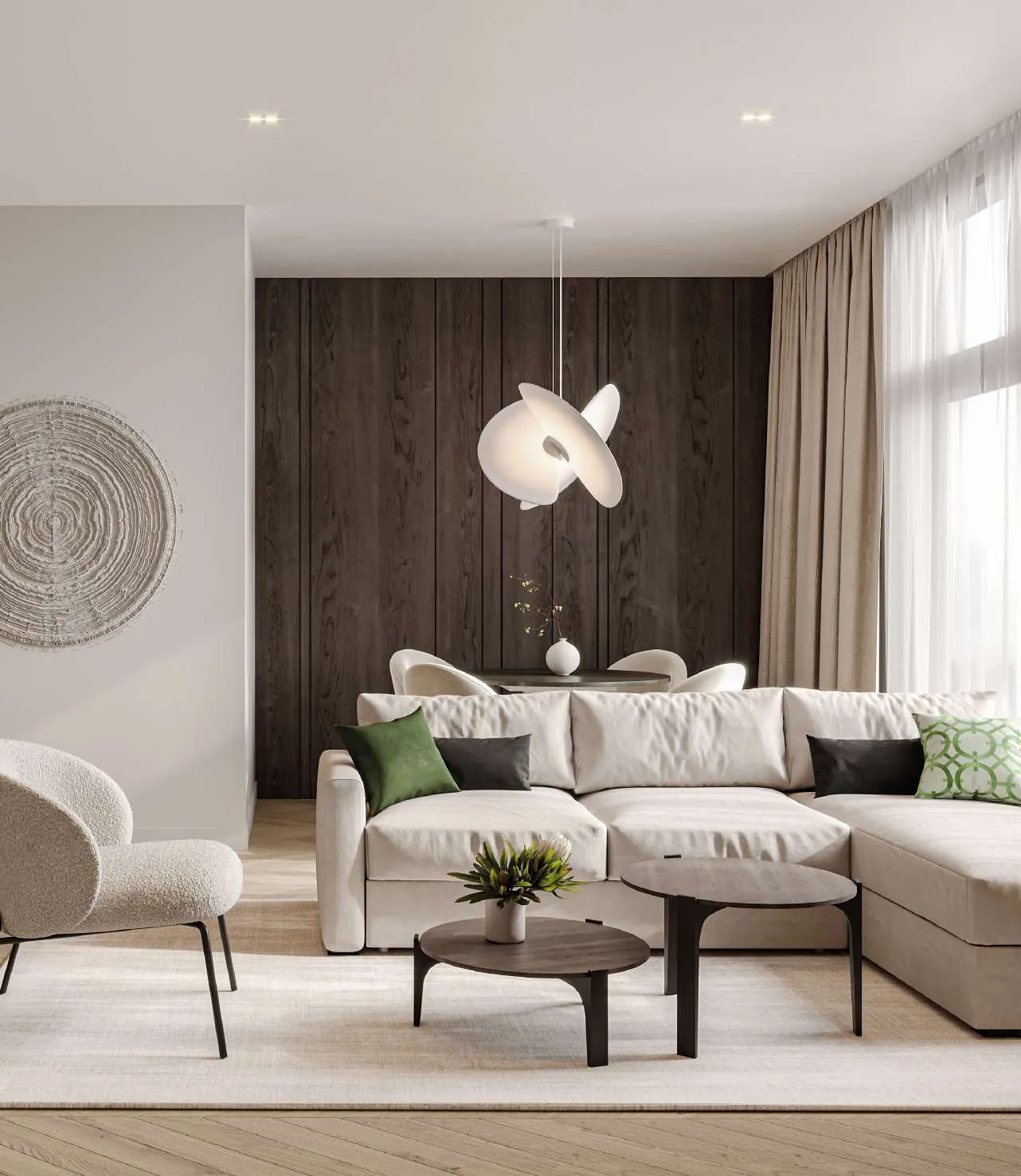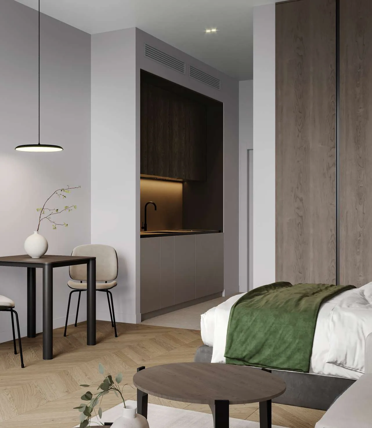 Inside, the residences are a showcase of refined simplicity and elegant design. The project offers a selection of studios, 1-bedroom, 1.5-bedroom, and 2.5-bedroom apartments, each with spacious layouts and soft, neutral interiors. Large windows invite sunlight into every corner of the home, while natural wood accents and clean finishes create a warm, welcoming ambiance. Every apartment is designed to promote comfort and sophistication, ideal for those who value both style and function in their everyday living.