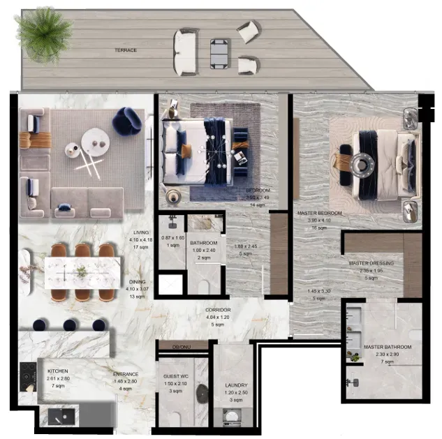 Modern finishing with high-quality materials defines each home’s interior. Residents enjoy a fully equipped kitchen designed for both function and elegance, while unfurnished layouts allow for personal expression. Every element has been considered to create spaces that balance comfort, craftsmanship, and contemporary design.