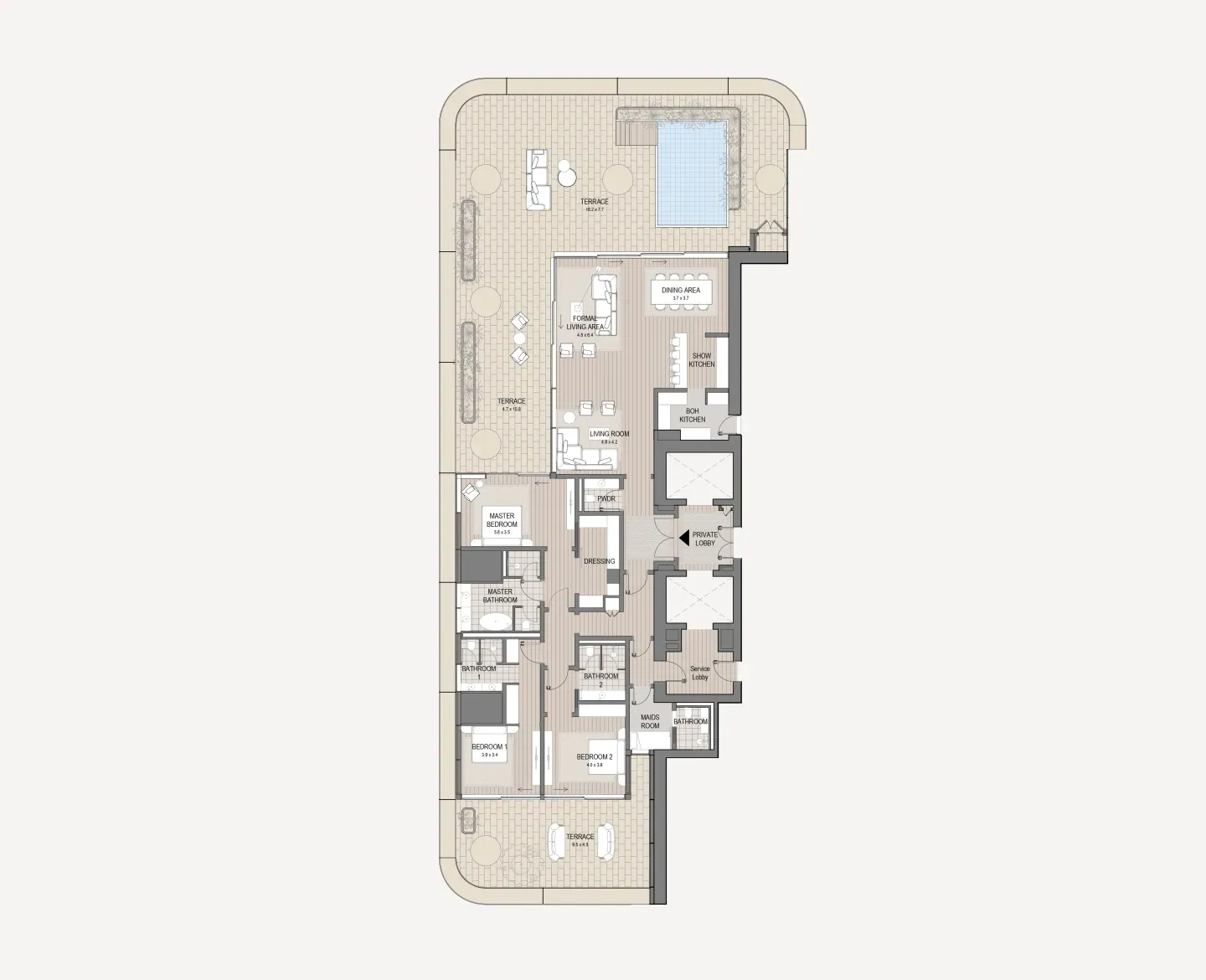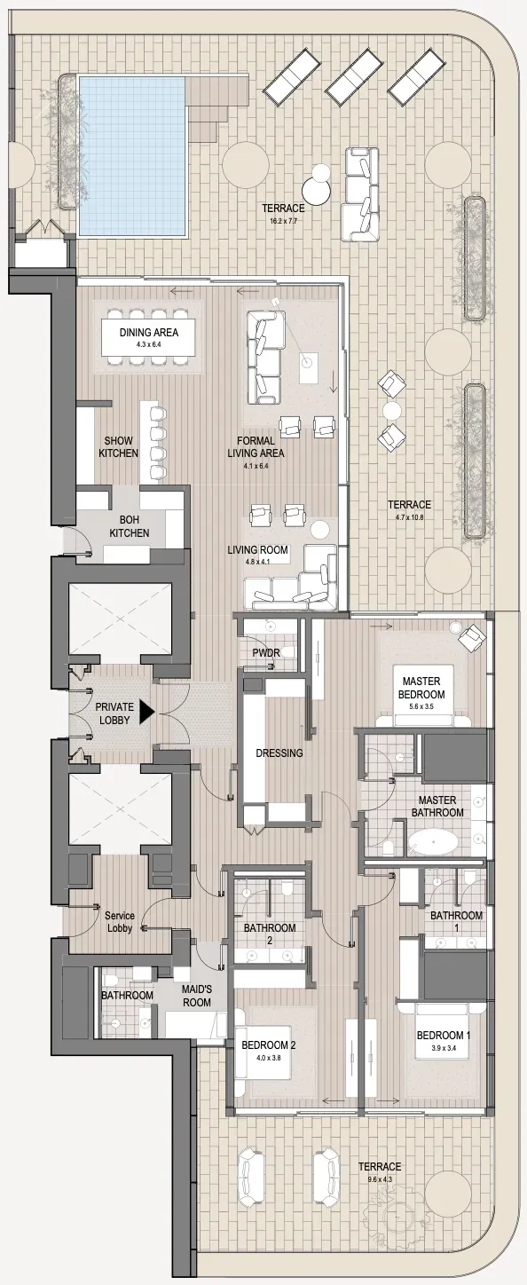 The 92 residences range from two to four-bedroom apartments and are crowned by two extraordinary penthouses. The residences exemplify the delights of indoor-outdoor living, with select residences boasting private terrace pools and double-height spaces.