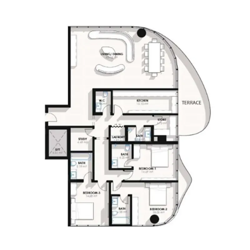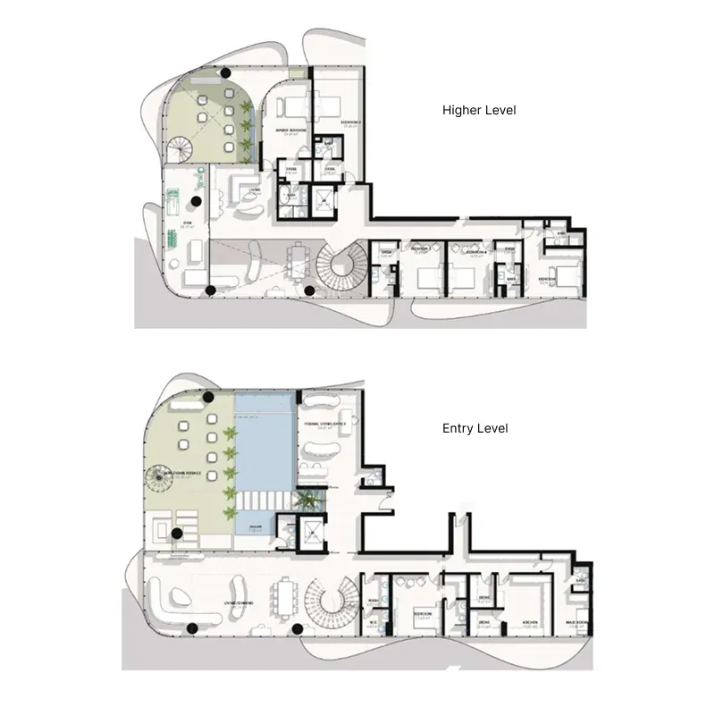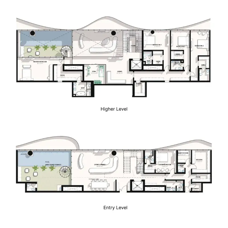 The project features a sophisticated selection of 1, 2, and 3 bedroom apartments, each thoughtfully designed with refined simplicity and natural light flowing through expansive layouts. Above them sit the prestigious 4 and 5 bedroom sky villas, each accessed by a private lift and offering uninterrupted views of Downtown Dubai and the Burj Khalifa. This combination of residences and sky villas ensures that every lifestyle need is met with exceptional elegance.
