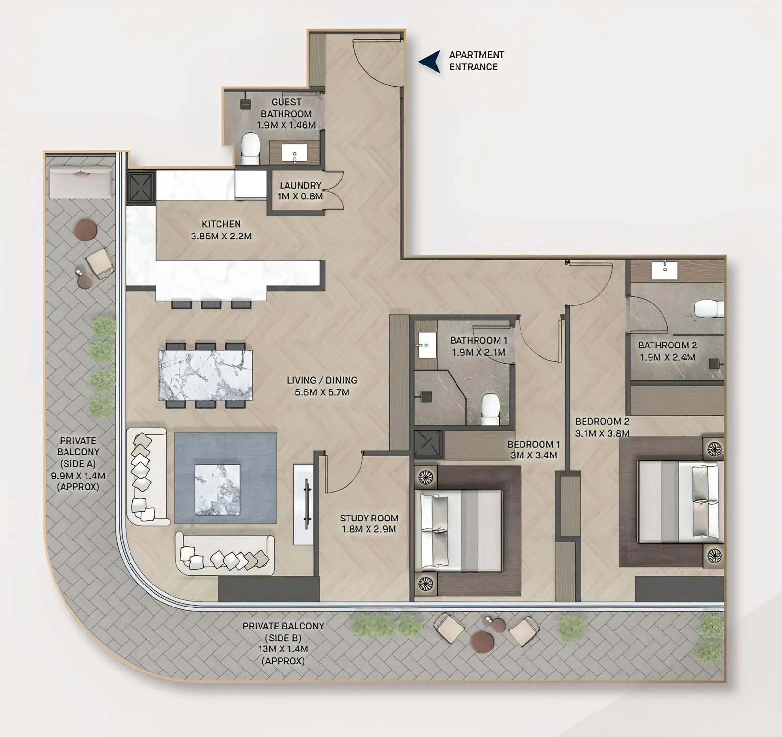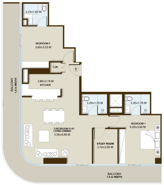 The apartments start at 1,500 sq.ft., providing ample living space. Each unit boasts a fully fitted kitchen equipped with premium Bosch appliances, ensuring a seamless and modern living experience.