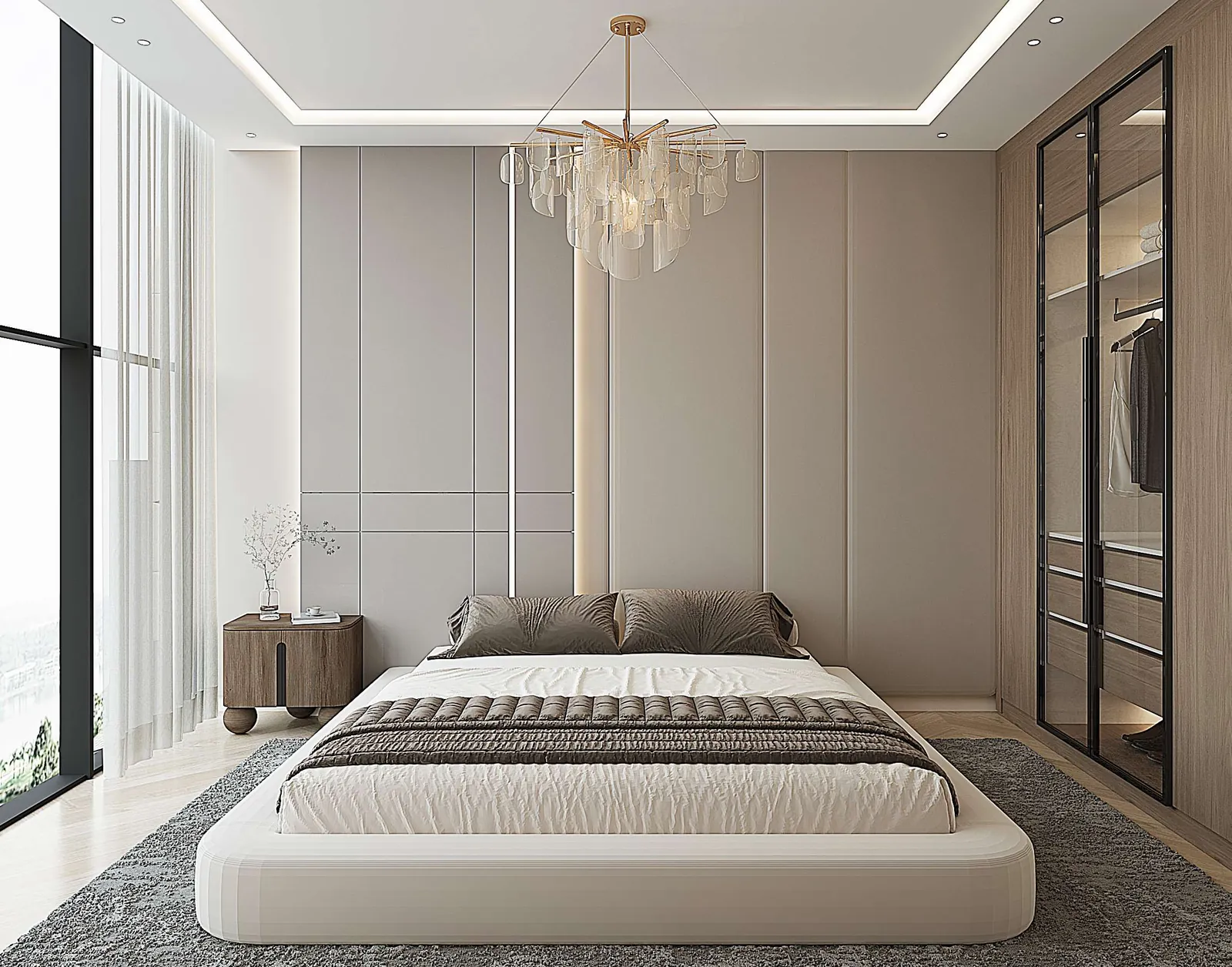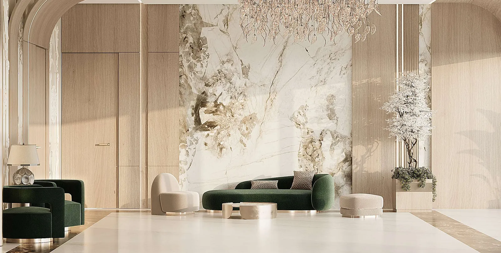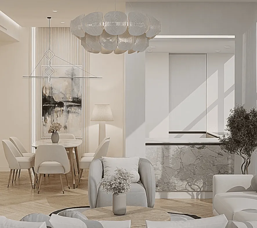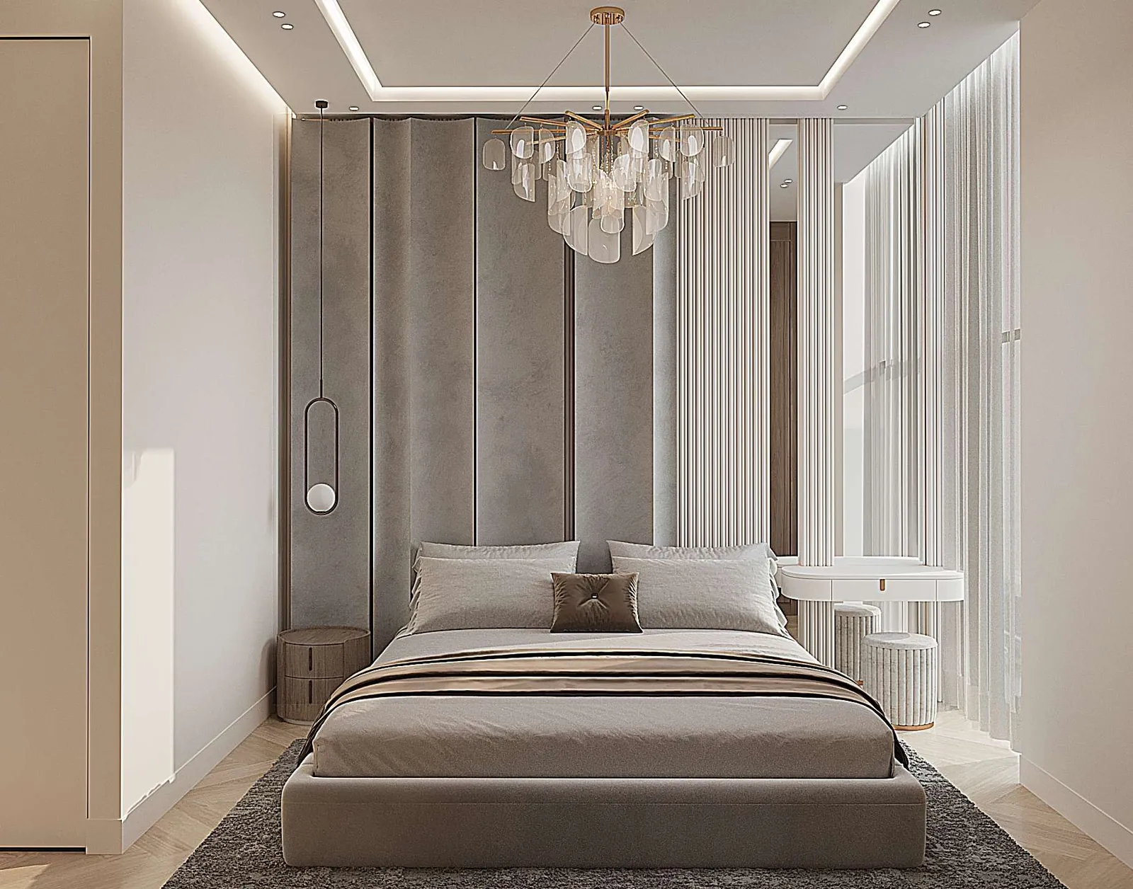Modern finishing with high-quality materials. Continuous wooden herringbone flooring.
