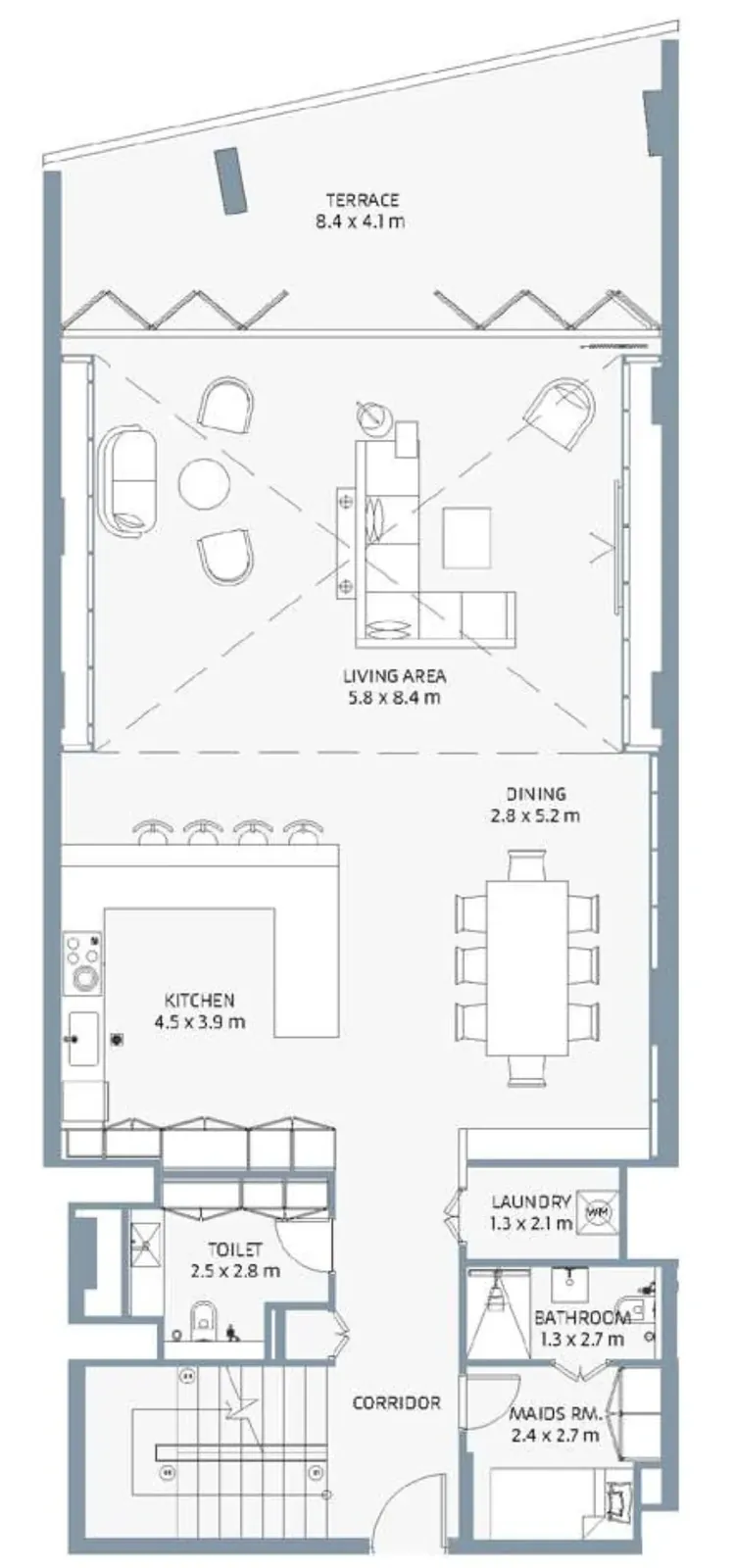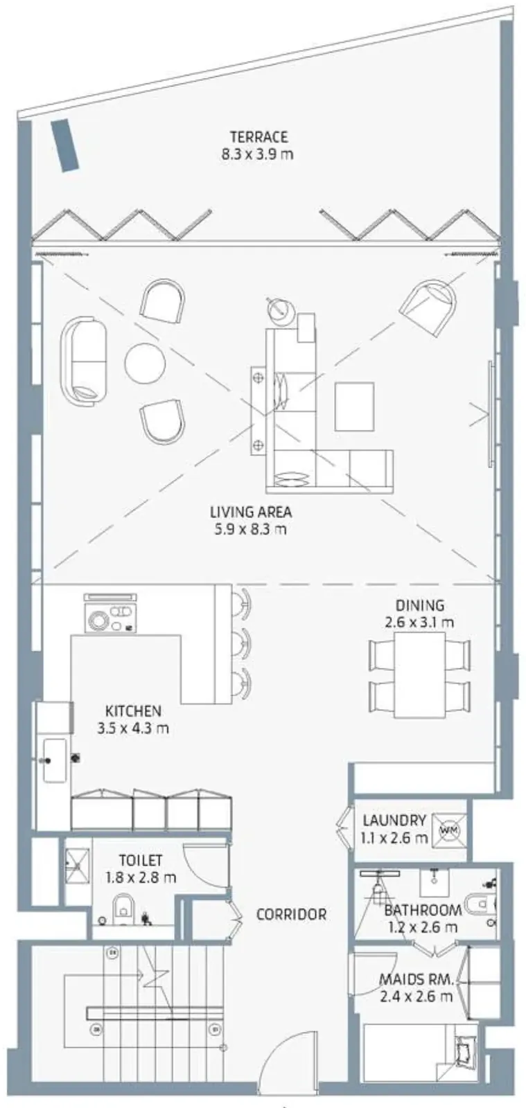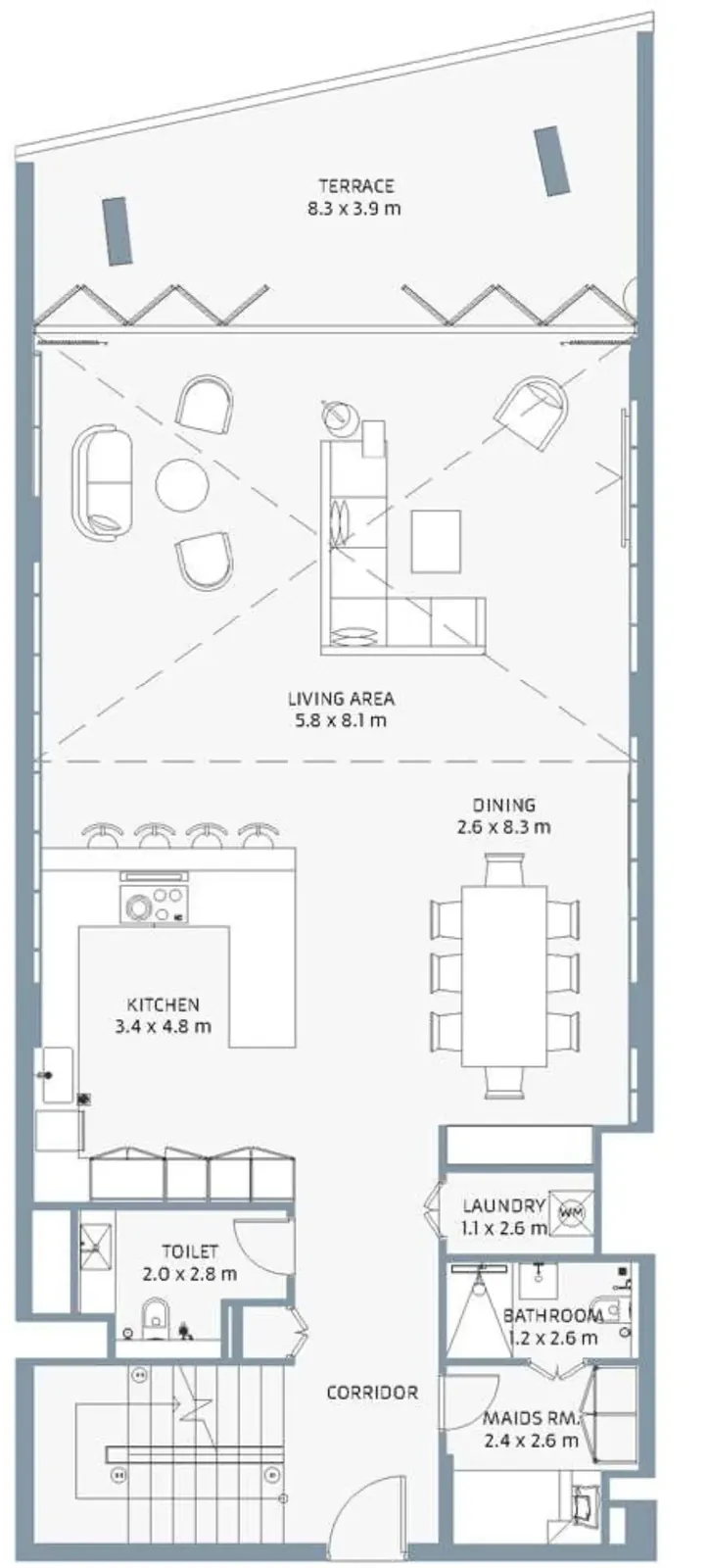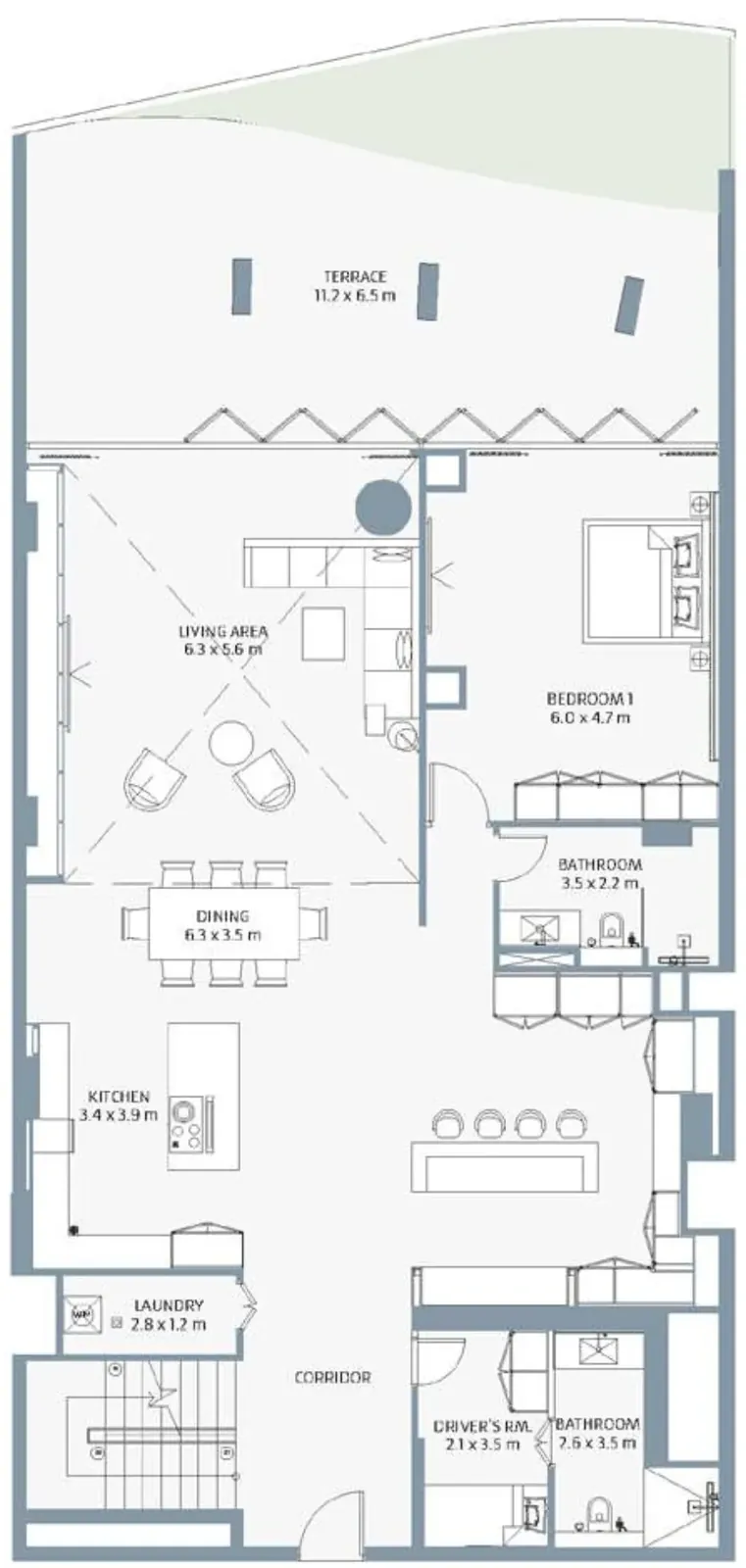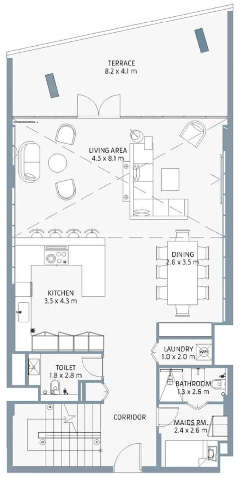 The residences feature large-format porcelain tile flooring, matt-painted walls, and gypsum ceilings with cove lighting, complemented by stained timber frame doors with wood veneer.