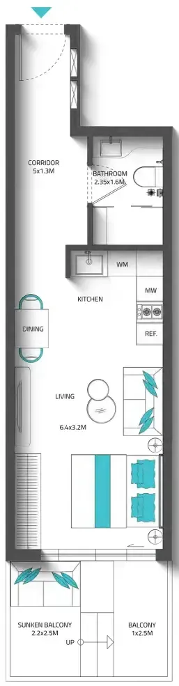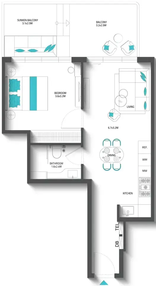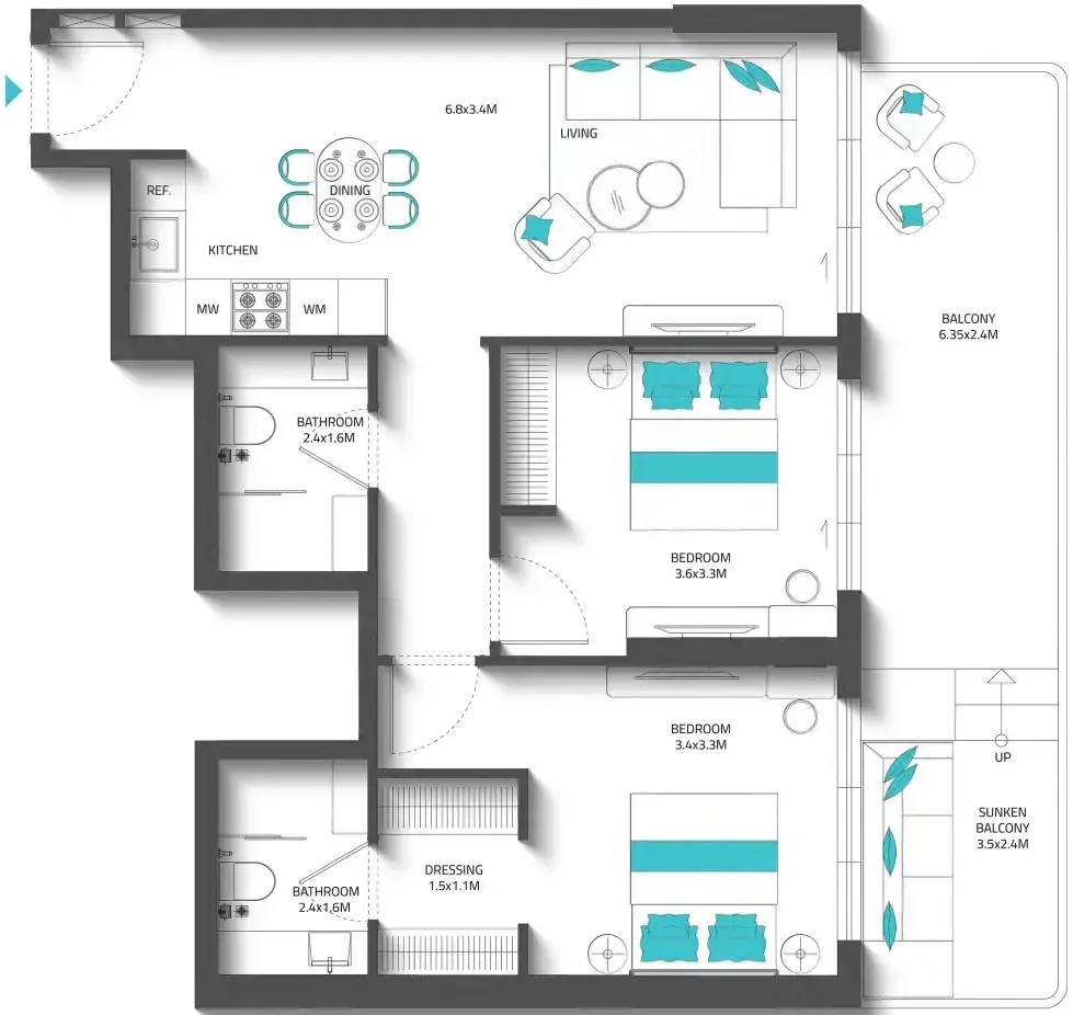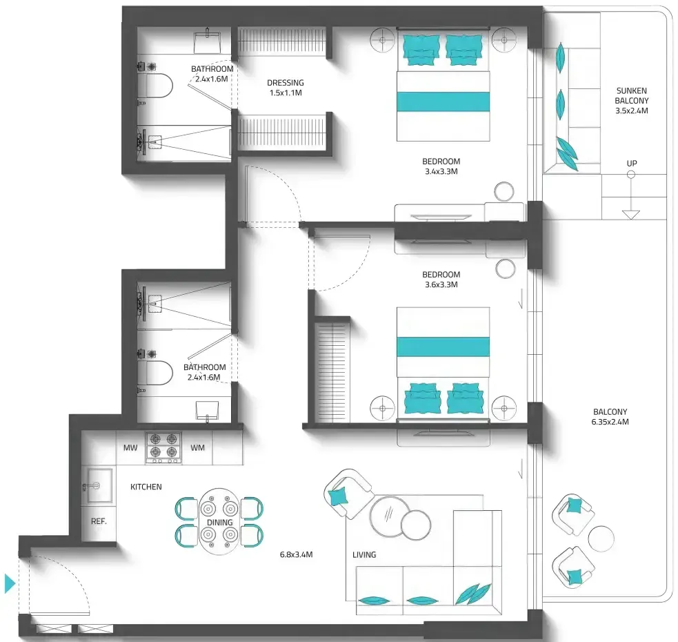 The residence offers a versatile selection of homes, including studios, one-bedroom, two-bedroom, and three-bedroom apartments ranging from 400 to nearly 1,900 sq.ft. Each unit is thoughtfully designed to maximize space, natural light, and comfort, with high ceilings, panoramic windows, and elegant lines that create a serene indoor atmosphere. The integration of sunken balconies as cool, outdoor extensions enhances the functionality and beauty of every layout, delivering a lifestyle that harmonizes sophistication with everyday practicality.