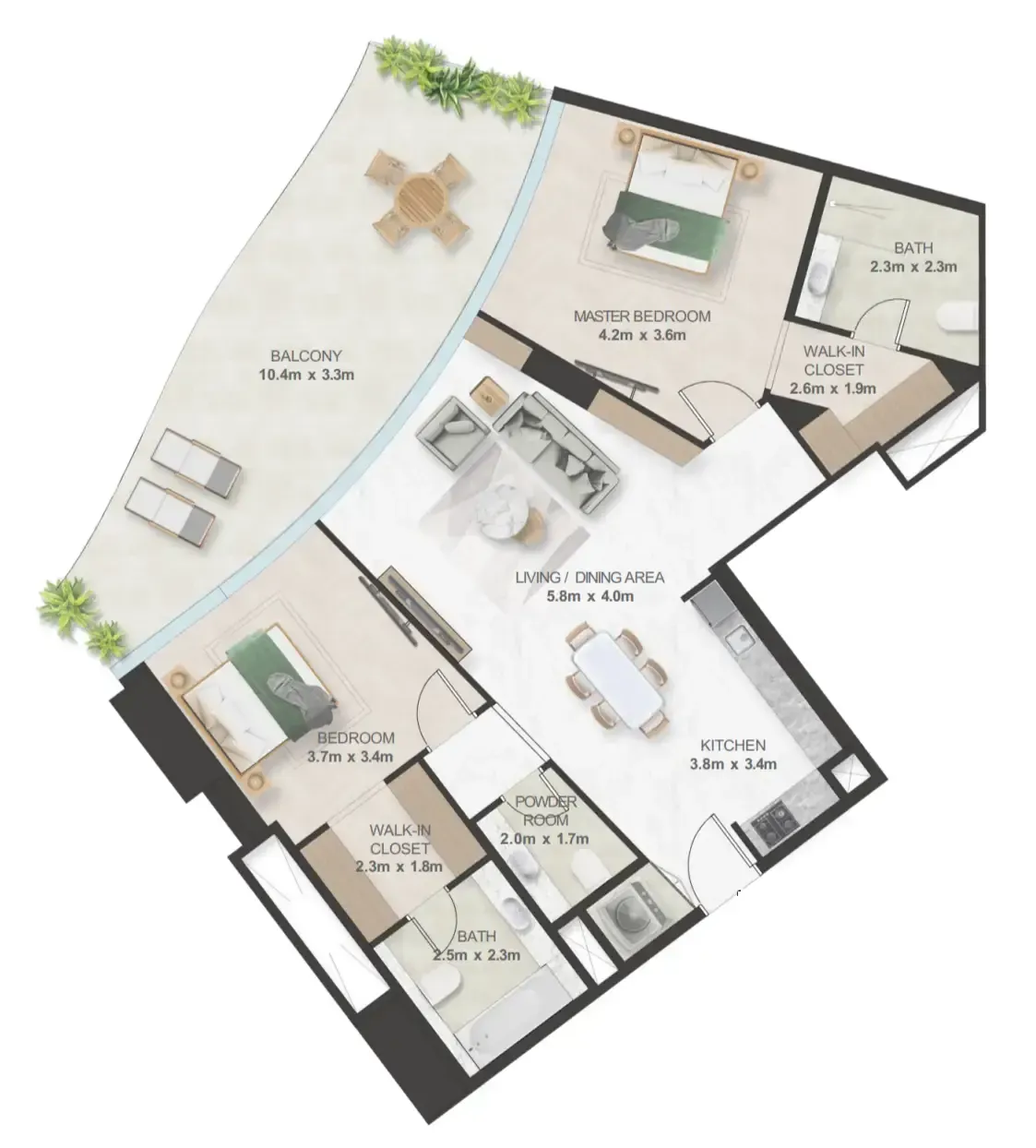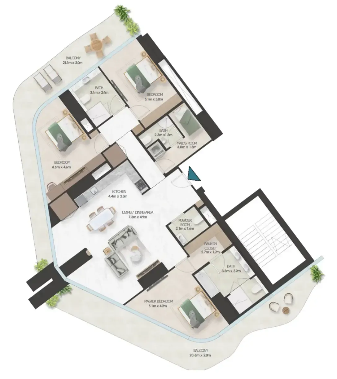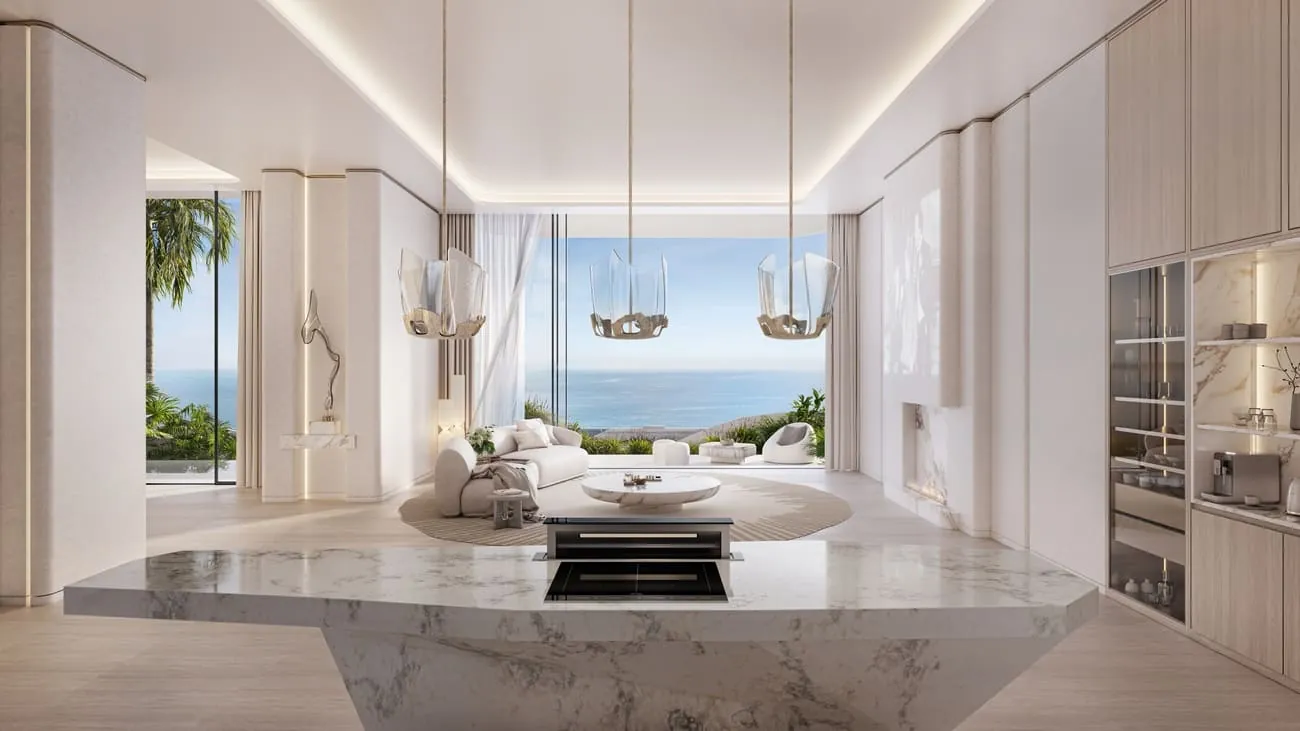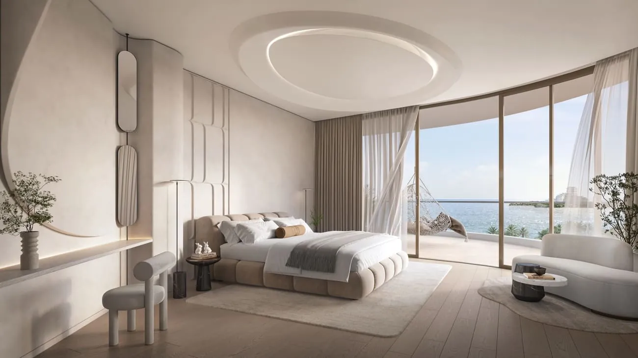 Oystra's interiors are crafted to reflect the project's overarching concept of fluidity and organic form. The design language seamlessly blends luxury and natural elements, creating spaces that feel both refined and welcoming. The aesthetic is modern, with a focus on curvature, softness, and understated elegance.