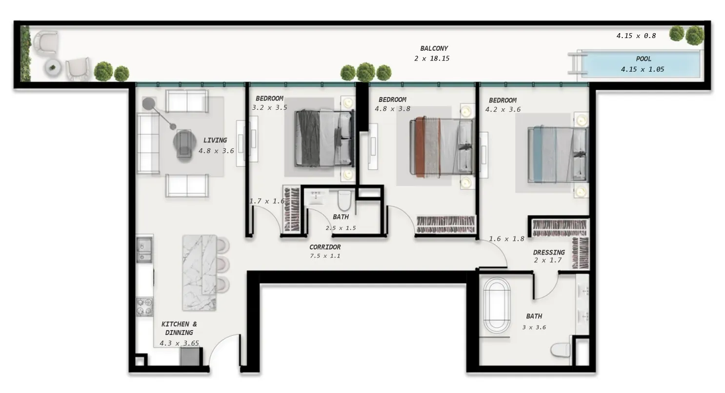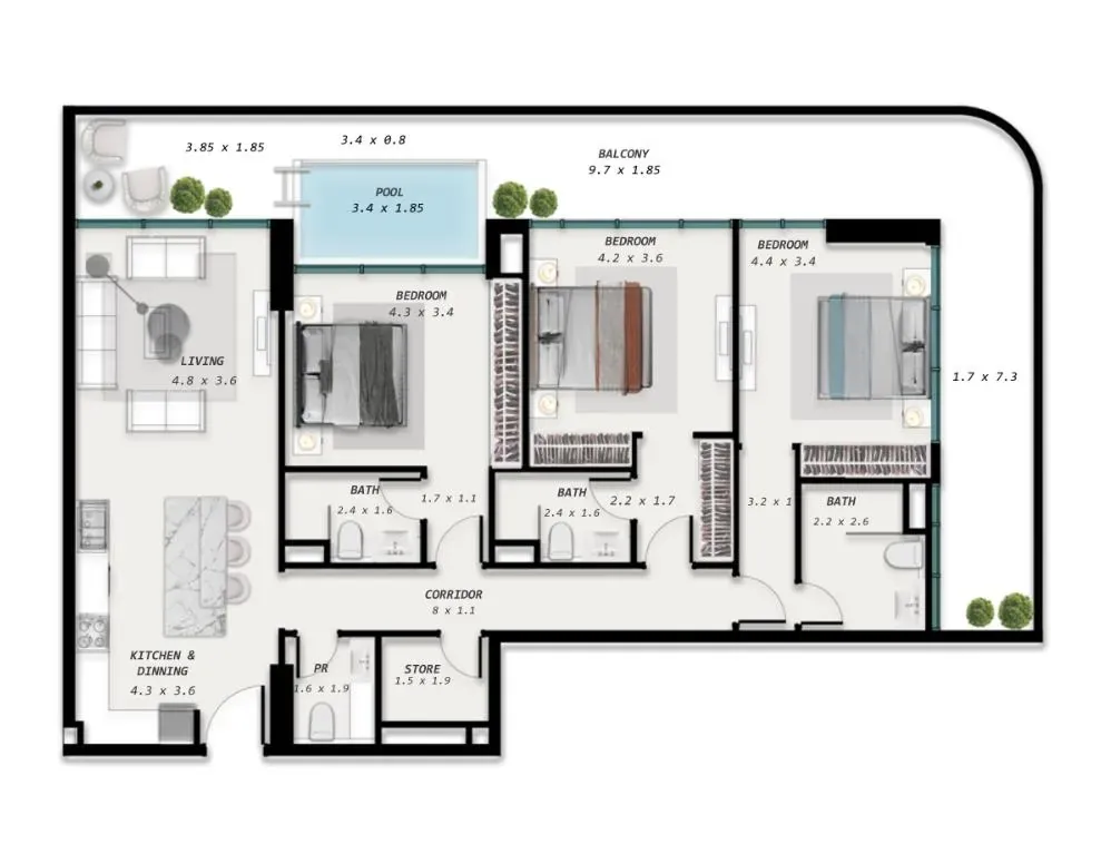 Each unit at Ocean Pearl 1 and 2 comes with high-quality built-in kitchen appliances and an advanced smart home system. Ocean Pearl 1 and 2 offer a range of unit options to suit your needs, including one bedroom with a pool, two bedrooms with a pool, four and three bedrooms with a pool.