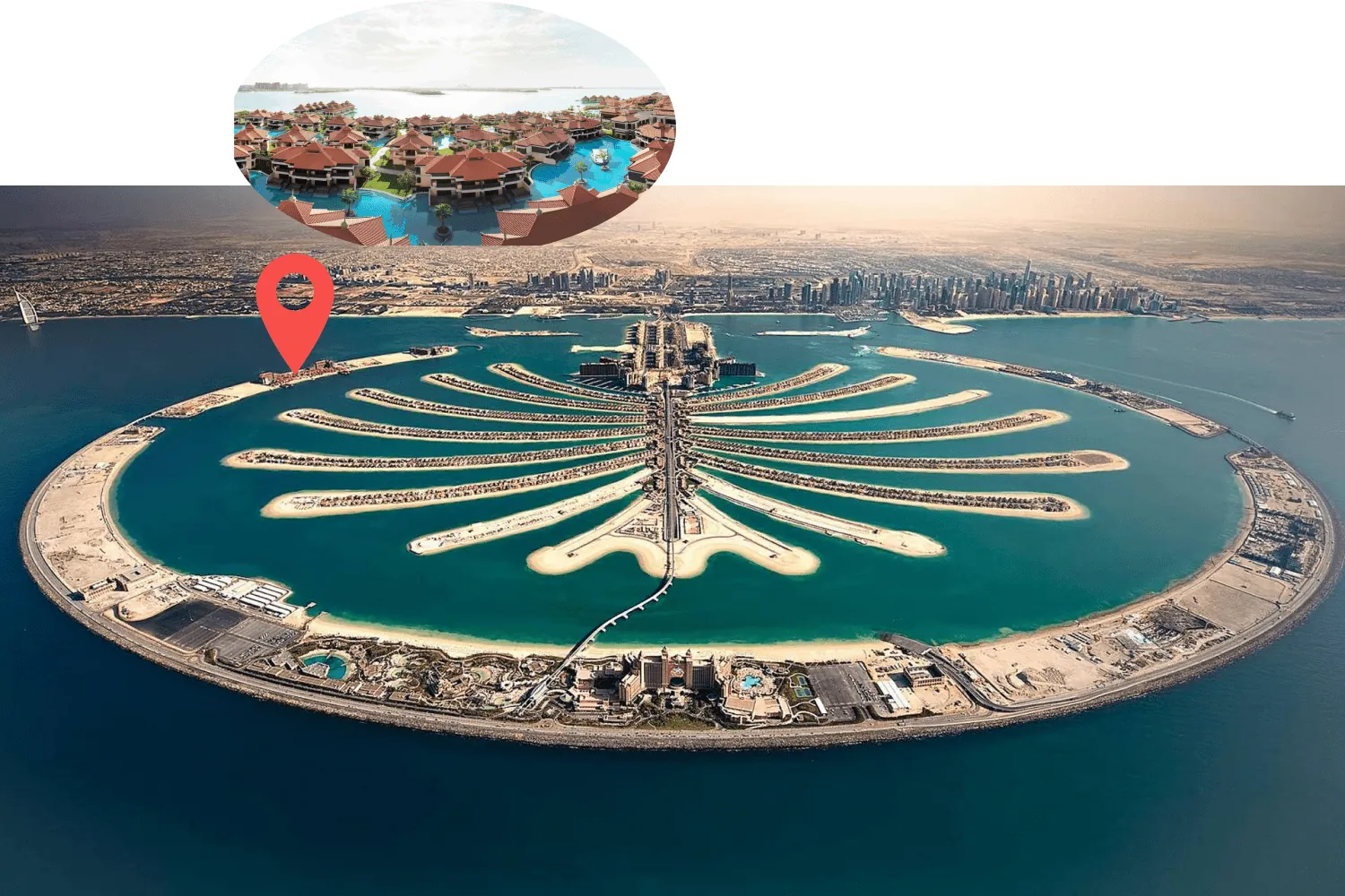 Palm Jumeirah is a luxurious community located on an artificial island that is shaped like a palm tree, with a trunk, fronds, and a crescent-shaped breakwater that surrounds the island.